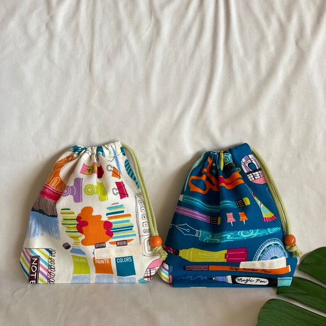 【オーダーOK】入園入学給食袋コップ入れ巾着★04カラフル文房具はさみペンのりコンパステープ絵具★縫い付けお名前小学校マチ★ラッピングプレゼント誕生日クリスマス