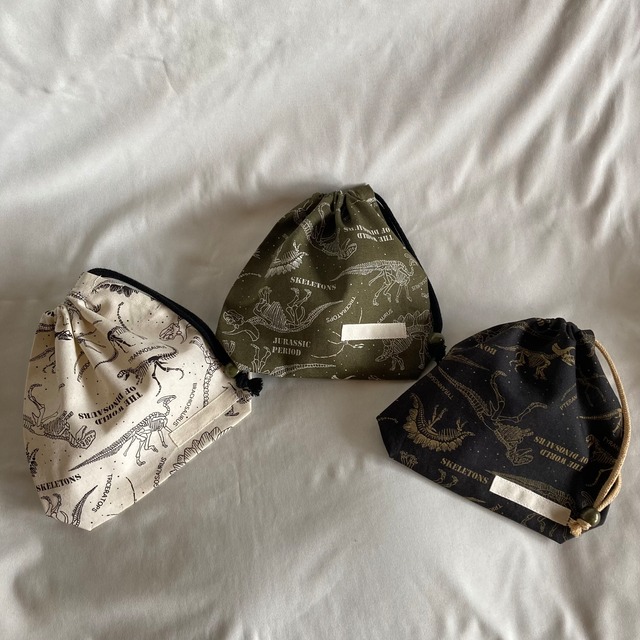 【オーダーOK】入園入学給食袋コップ入れ巾着65恐竜化石骨★縫い付けお名前小学校マチ片方から紐を引く巾着
