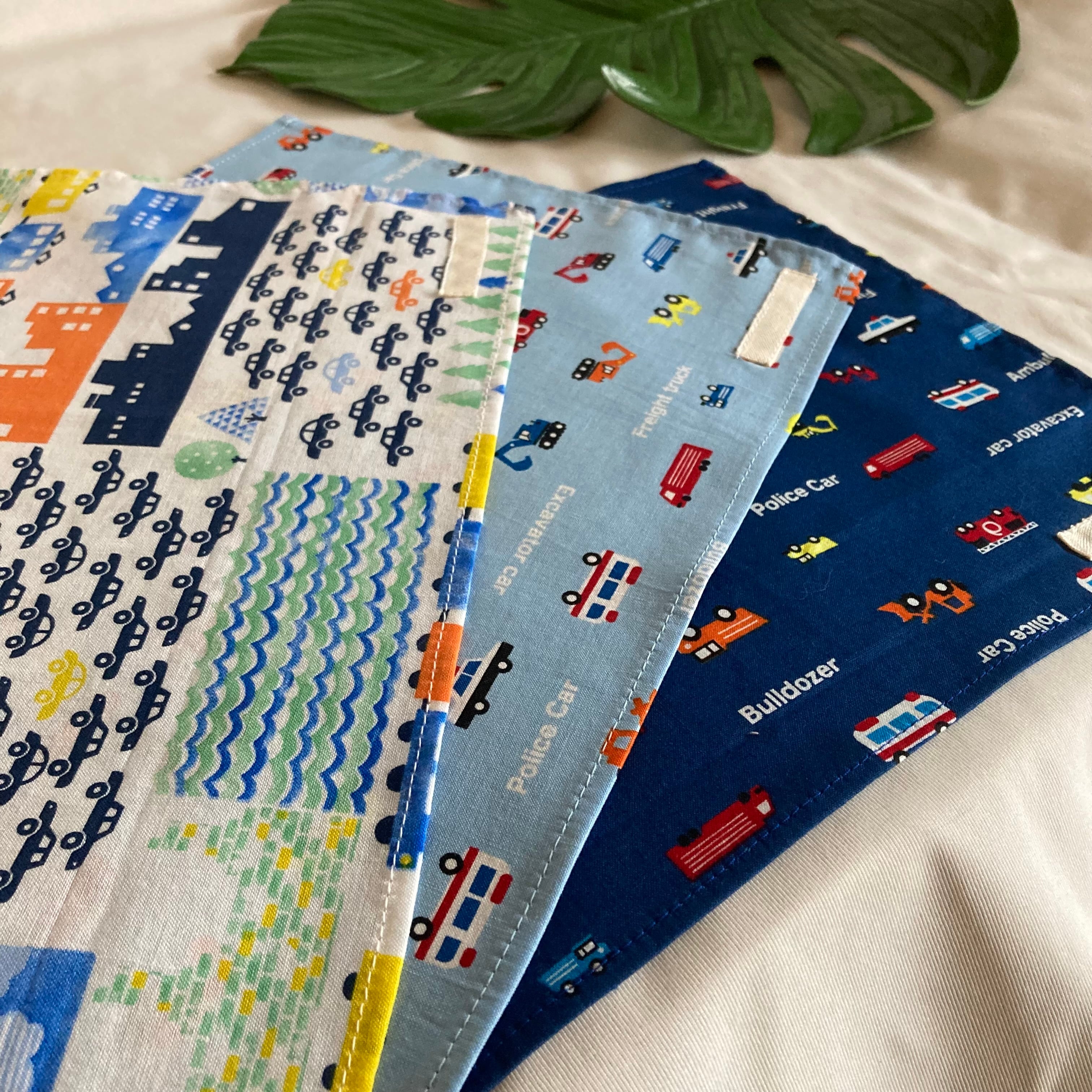 A4ランチョンマット3枚セット★働く車乗り物パトカー救急車工場★入園入学ランチクロスナフキン★縫い付けお名前幼稚園保育園幼児★ラッピングプレゼント誕生日トラック消防車