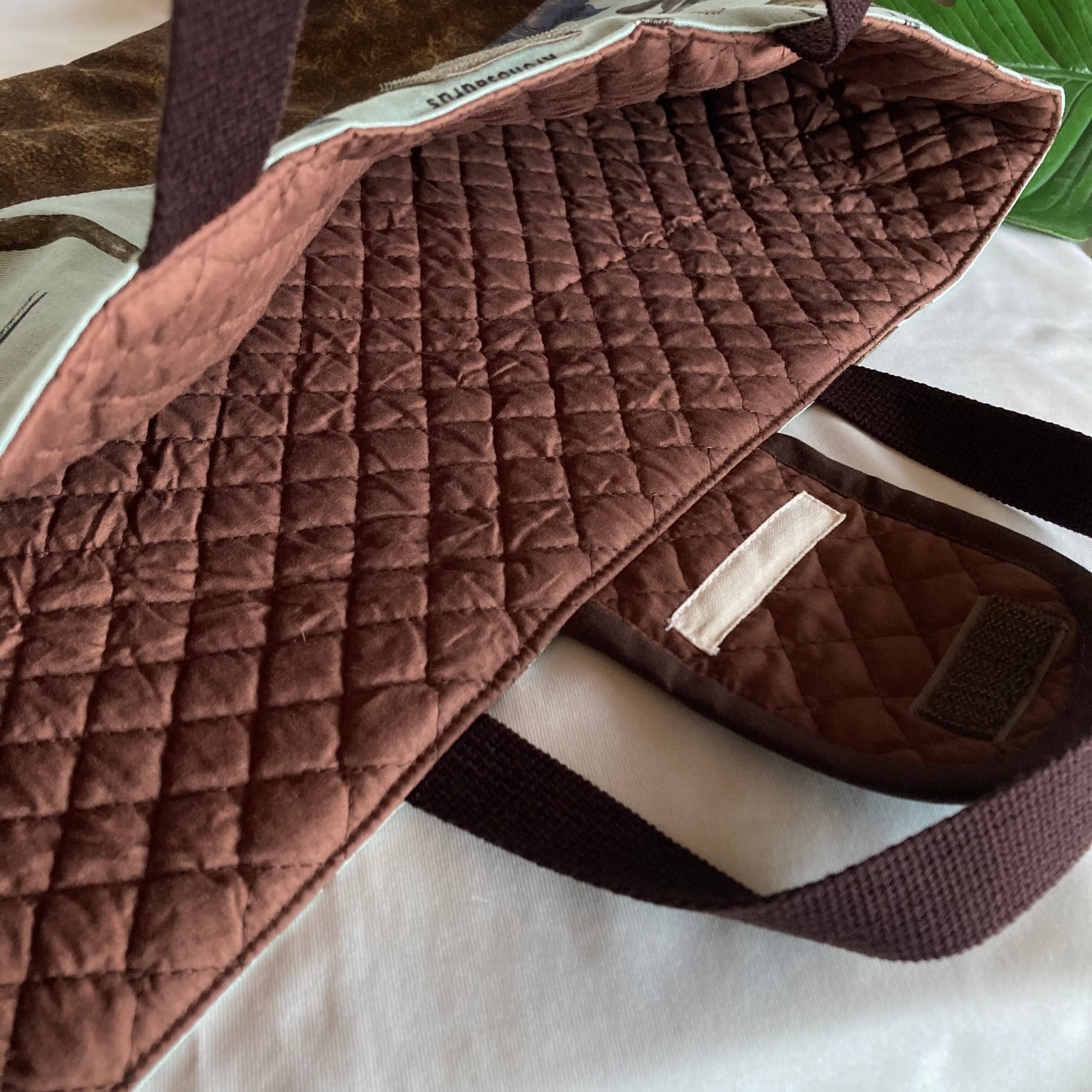 【サイズ】入り口ヨコ約56cm、タテ(マチ含まず)約24cm、底:ヨコ約47cm×マチ約8cm、持ち手2.5cm幅×長さ34cm