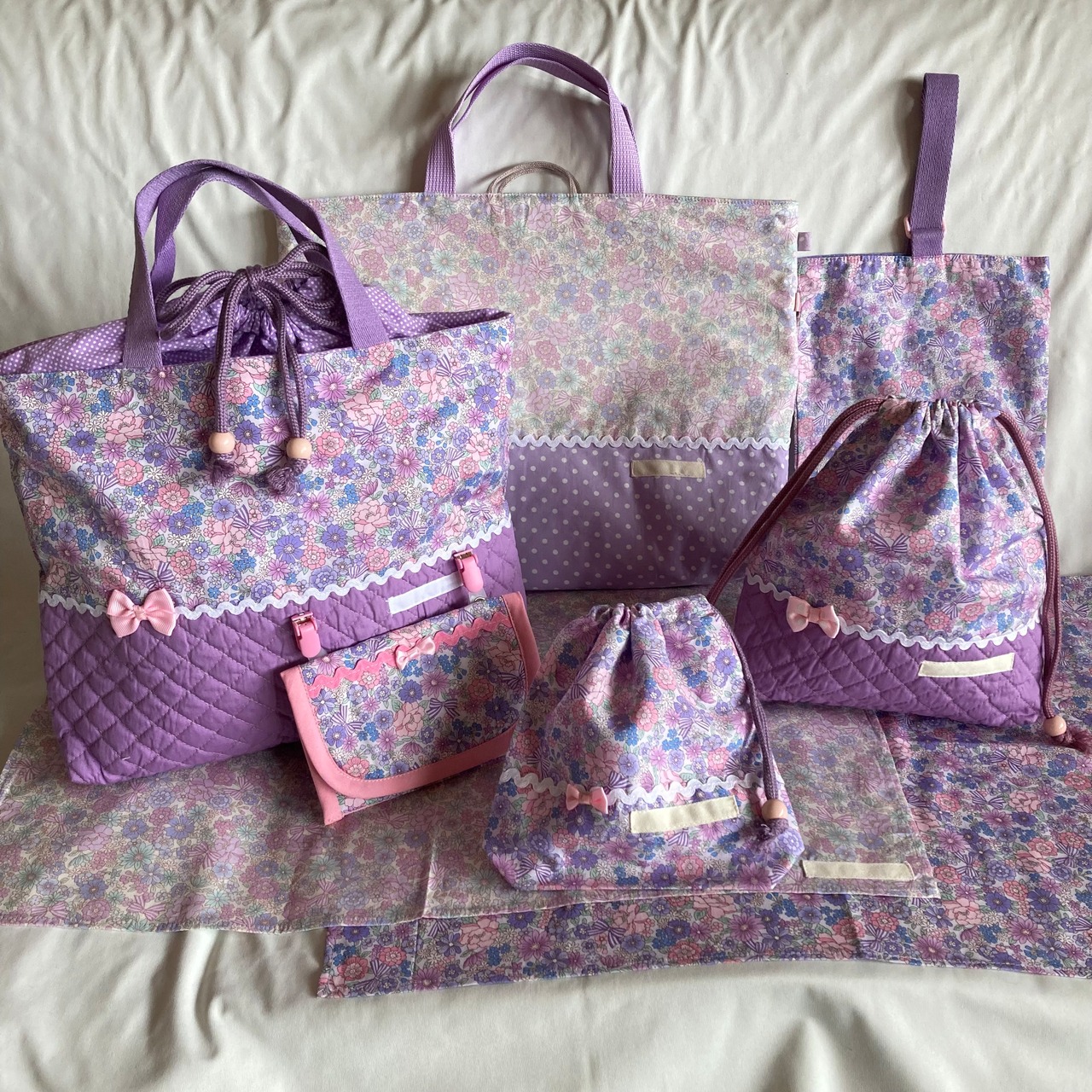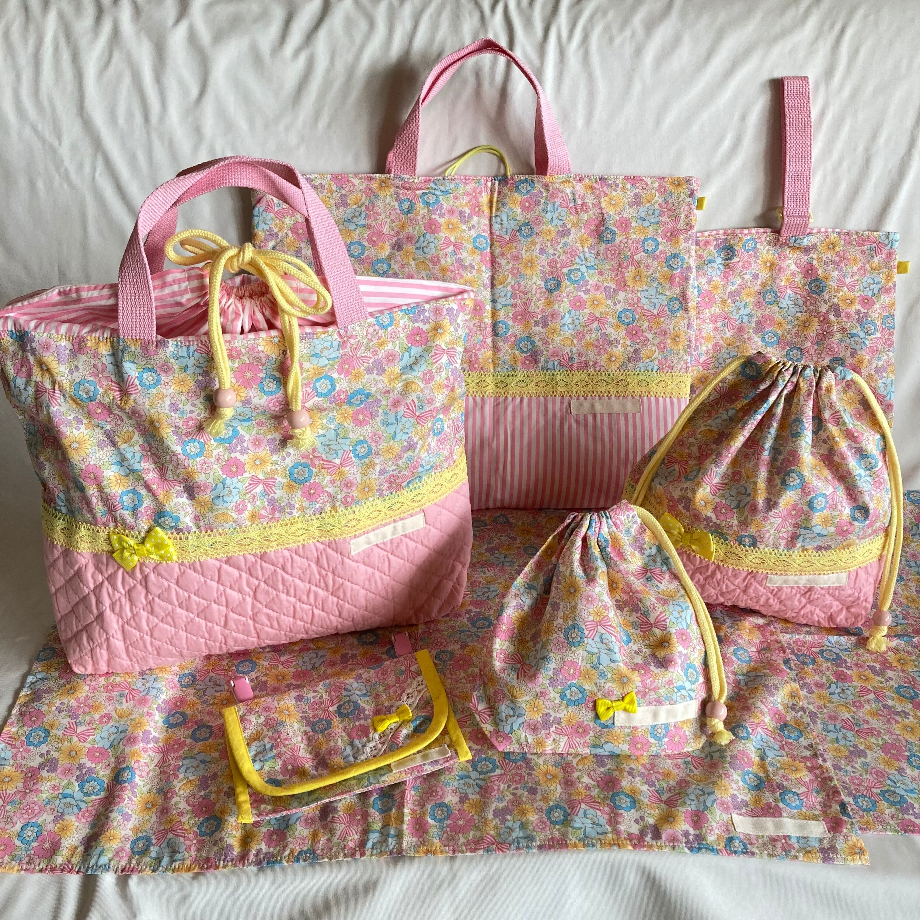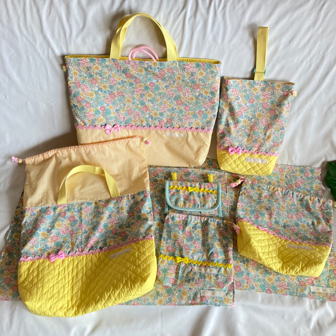 【オーダーOK】入園入学セット45お花とリボンミント★手提げレッスンバッグ絵本袋シューズケースコップ上履き給食お着替え体操着巾着お弁当ランチョンマット移動ポケットナップサック★縫い付けお名前小学校キ