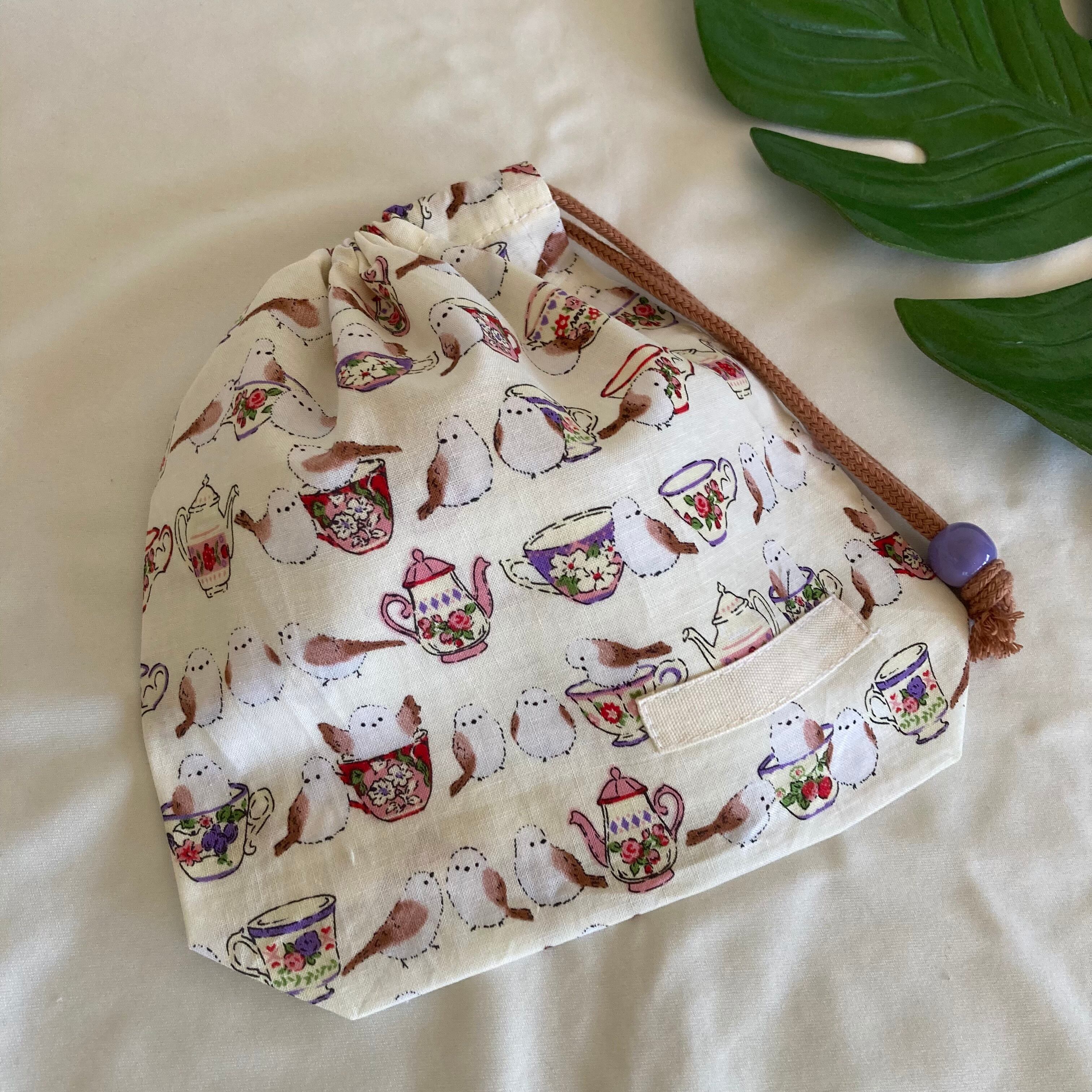 【オーダーOK】入園入学大きいランチョンマット(60×40㎝)コップ入れ巾着給食袋★シマエナガのティータイムしまえなが鳥★給食ナフキン弁当ランチクロス小学校机40×60㎝名前