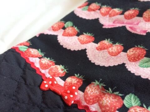 【素材】いちごPT、キルティング黒、ブレード・リボンなどで飾りました。