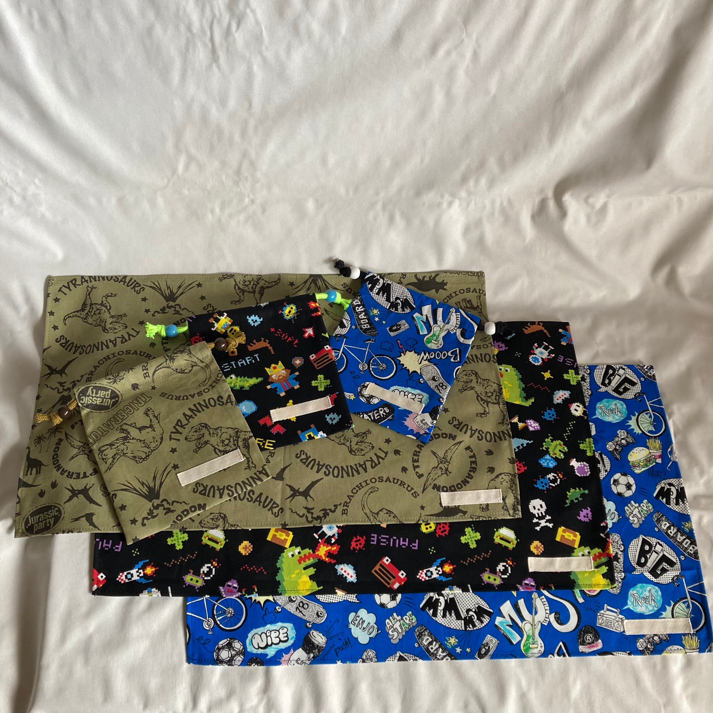 【M様オーダー品】ランチョンマット両方から紐を引く巾着給食袋★恐竜僕のお気に入りピクセルゲーム