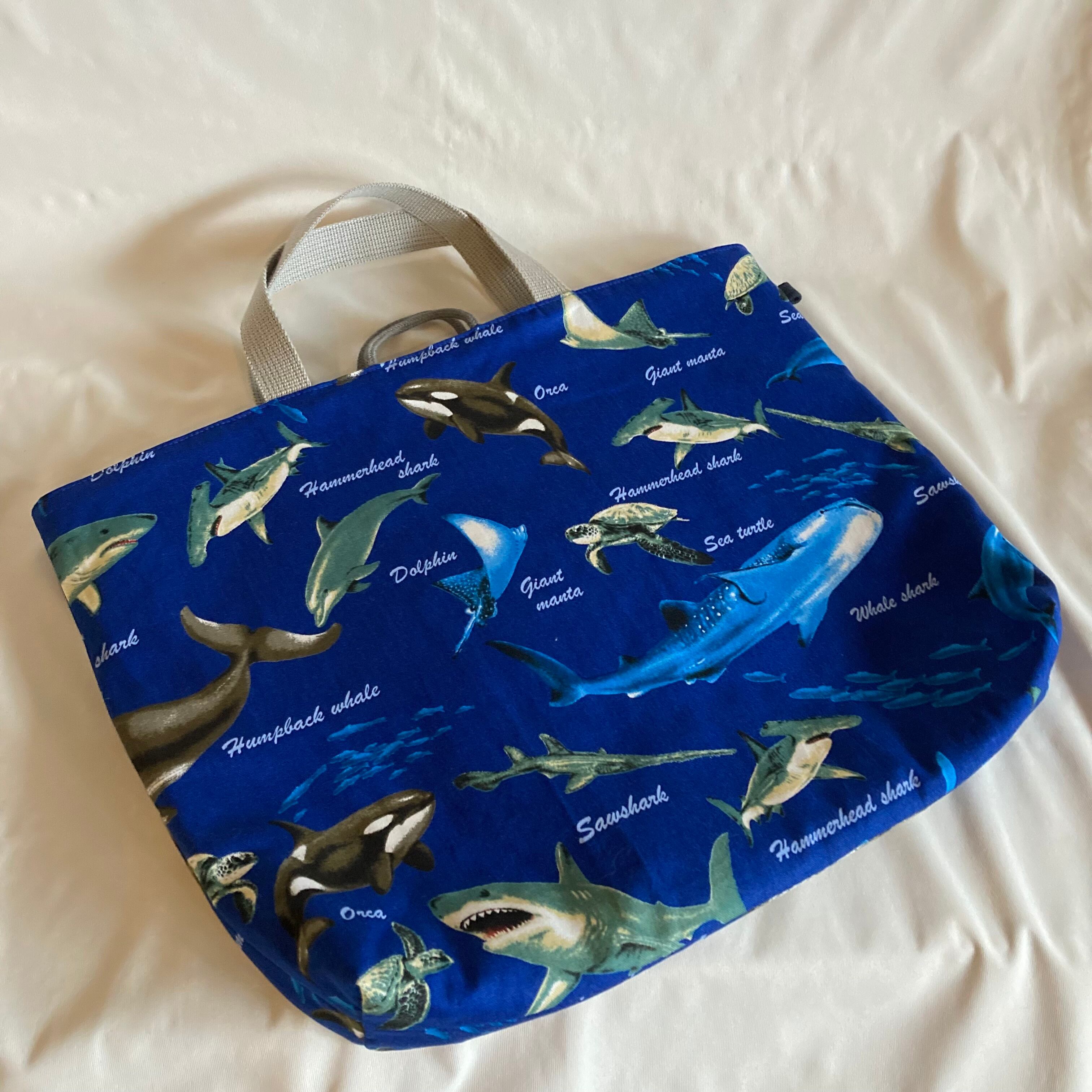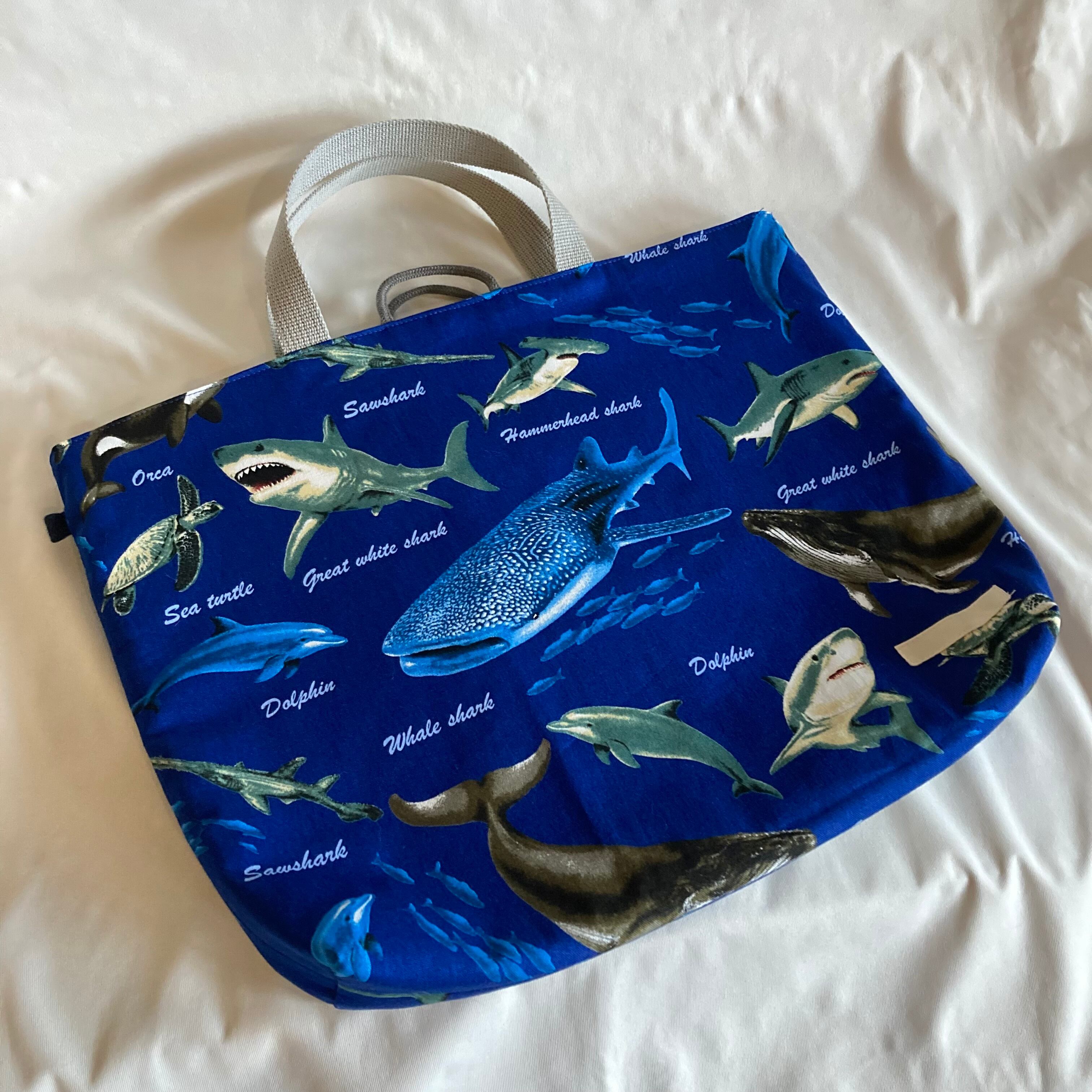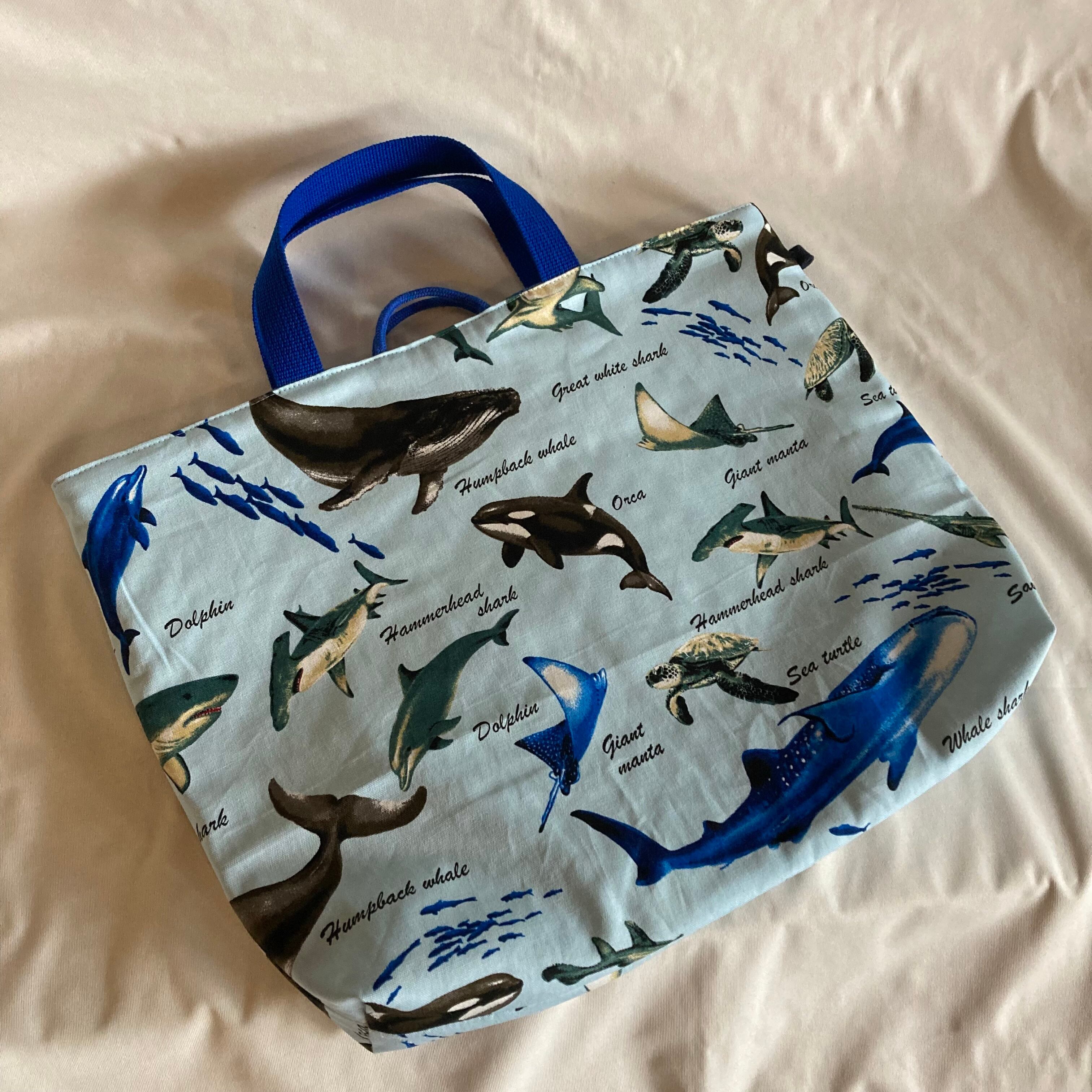 【床につかない!!】入園入学レッスンバッグ手提げ絵本袋リバーシブル★迫力の海の生き物水族館サメシャチいるかくじらカ魚★名前キルティングマチレースポケット小学校習い事ラッピングプレゼント持ち手