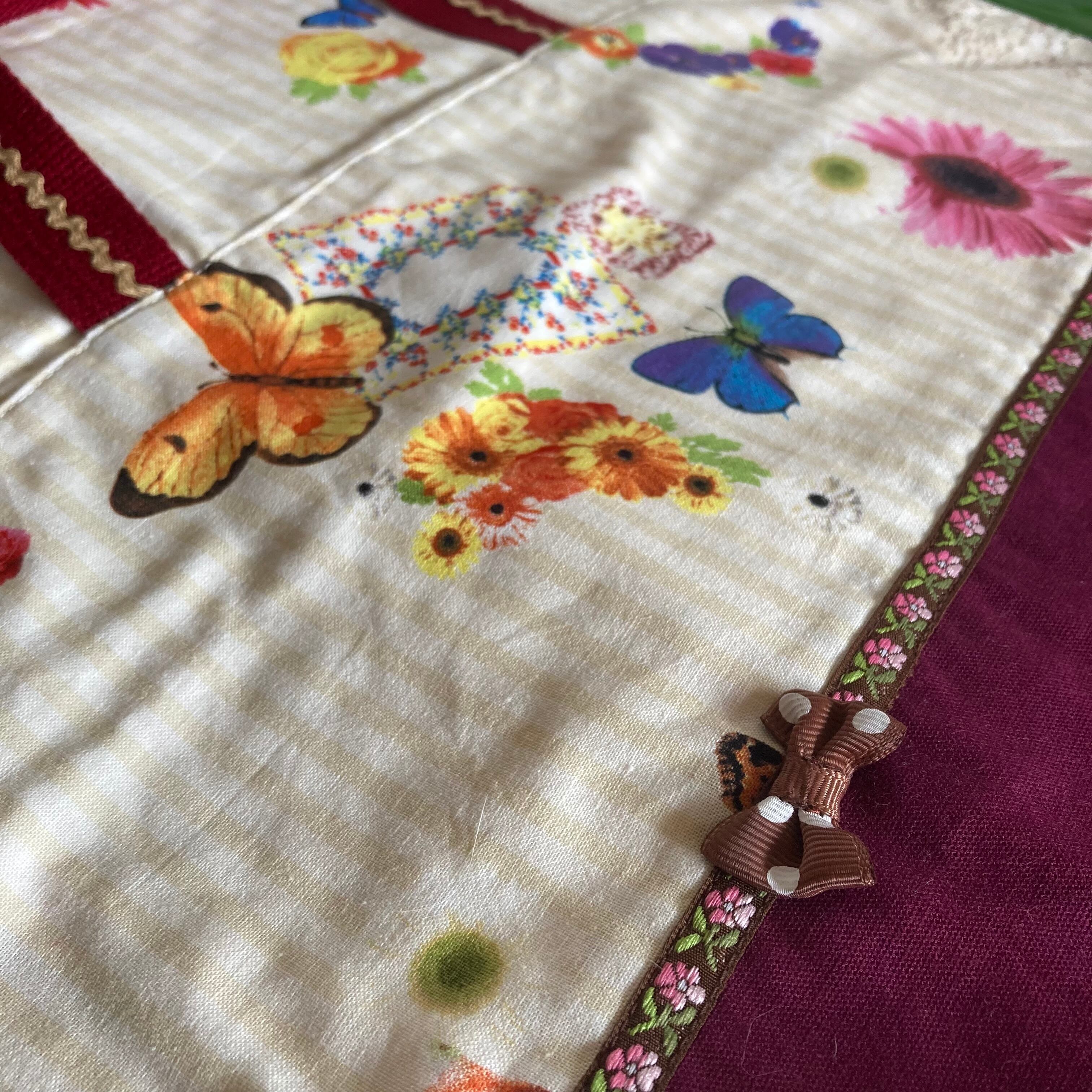 【素材】花PT、無地ボルドー、チロリアンテープ・リボンなどで飾りました。
