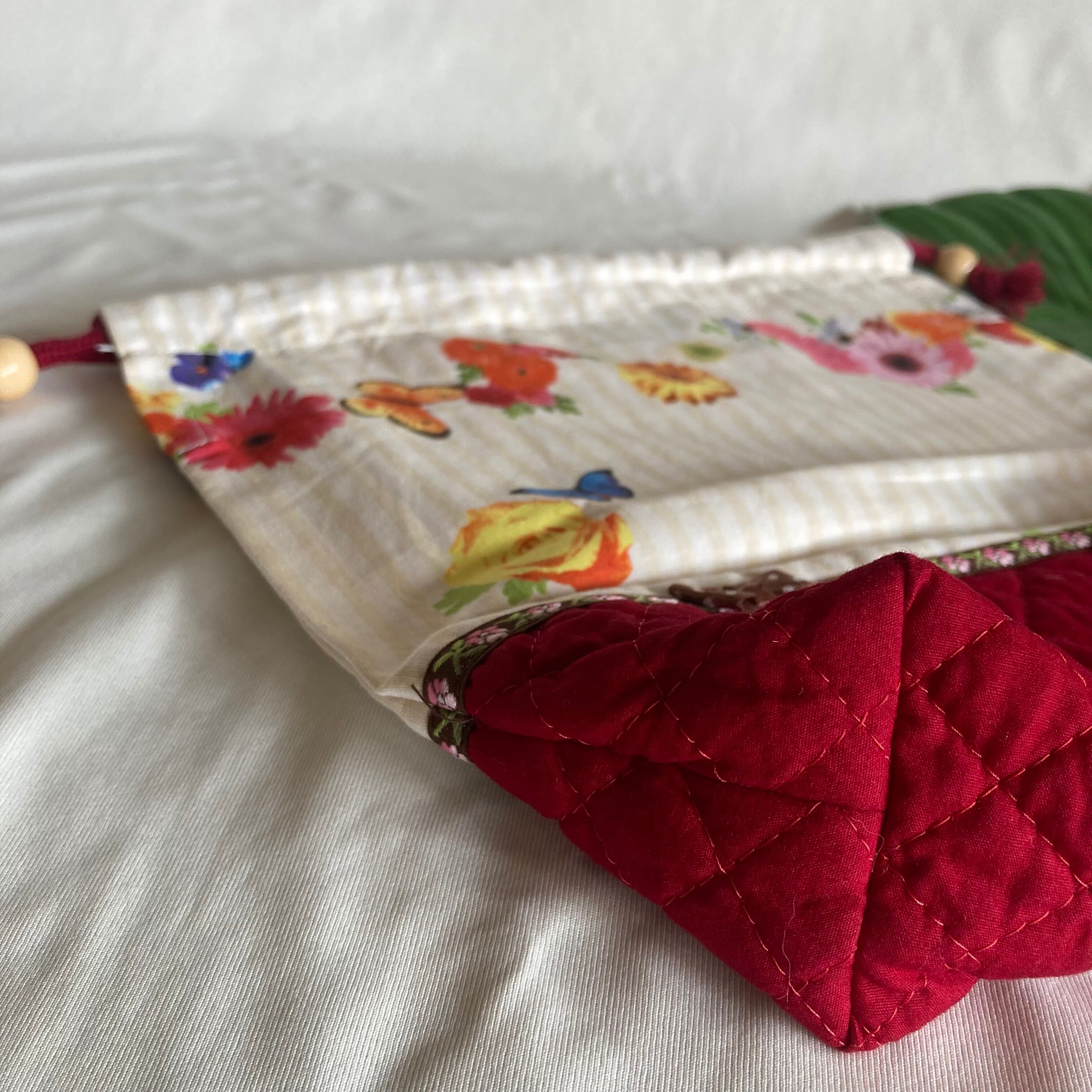 【素材】花PT、キルティングボルドー、チロリアンテープ・リボンなどで飾りました。