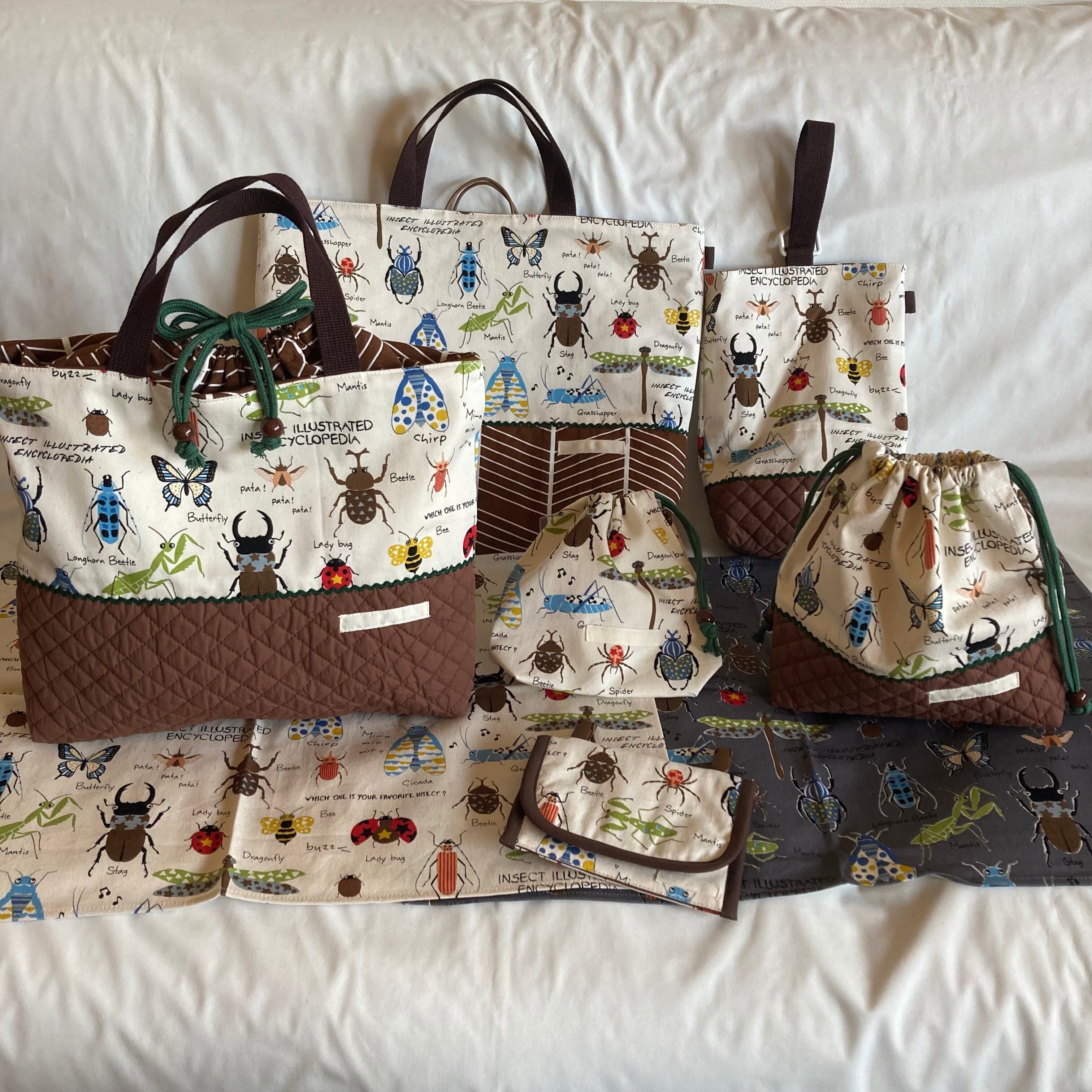 【オーダーOK】入園入学ランチバッグお弁当入れ巾着57昆虫図鑑せみクワガタWかぶと虫てんとう虫クモ蝶々ハチ★縫い付けお名前小学校キルティングマチ★ラッピングプレゼント誕生日クリスマス
