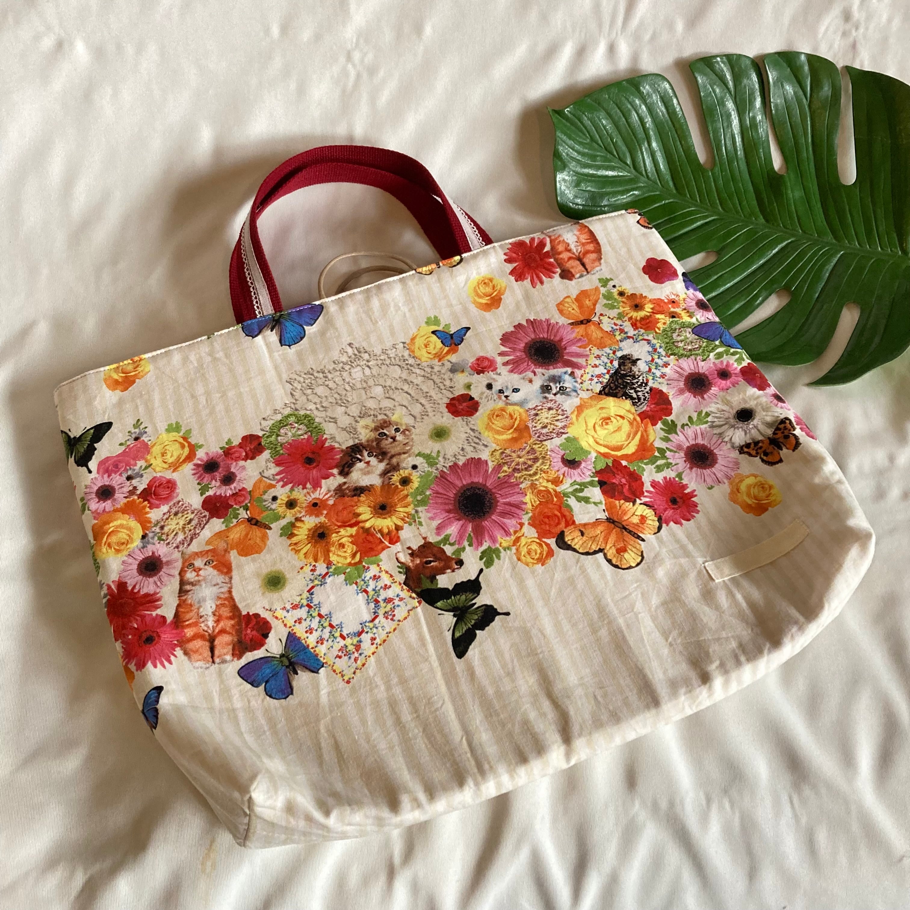 【オーダーOK】床につかない!短いループ付きレッスンバッグ手提げ絵本袋リバーシブル入園入学20花蝶猫花鹿ボルドー★縫い付けお名前小学校マチ付きキルティングポケット