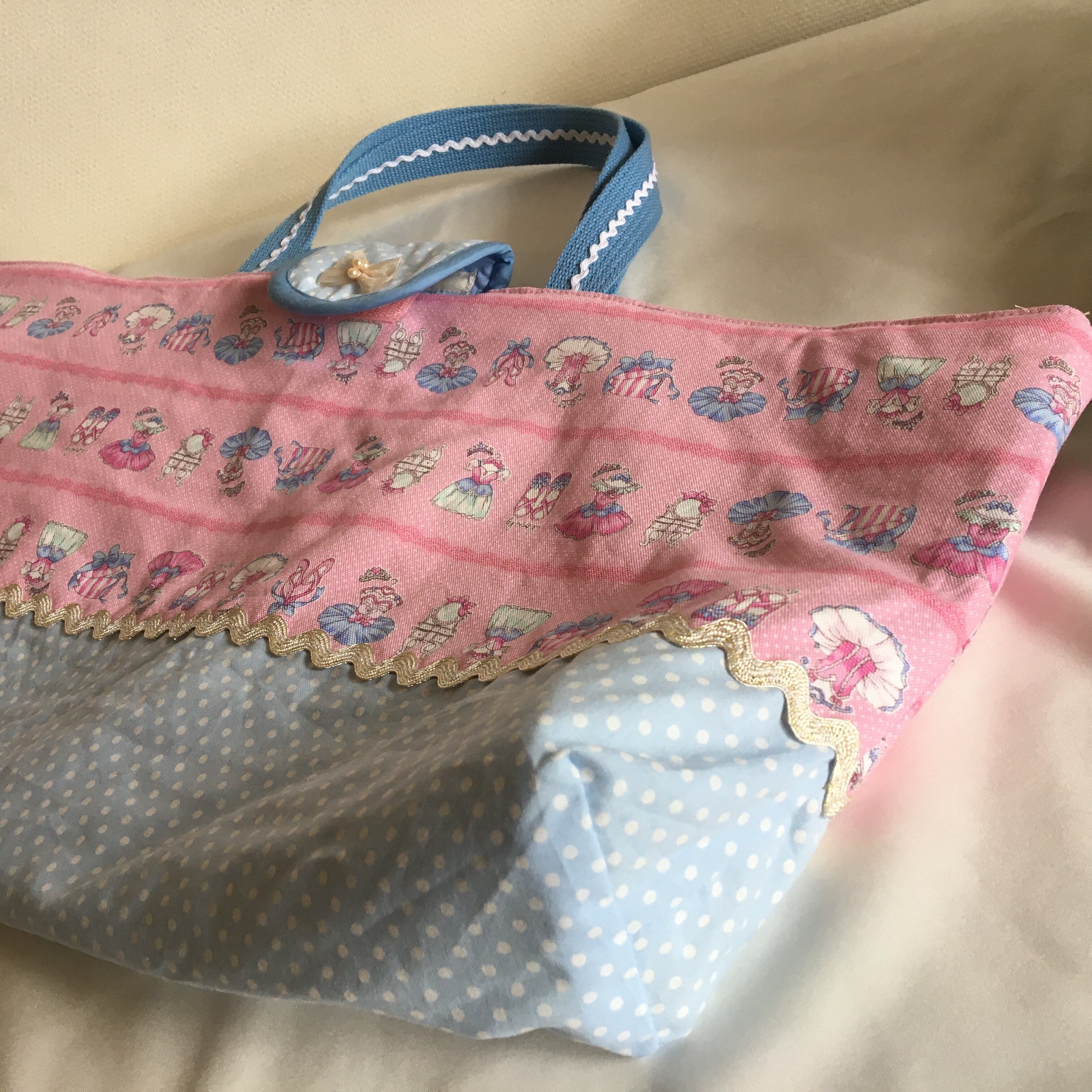【素材】バレエPT、ドット水色、キルティングアクア、ブレード・リボンで飾りました。