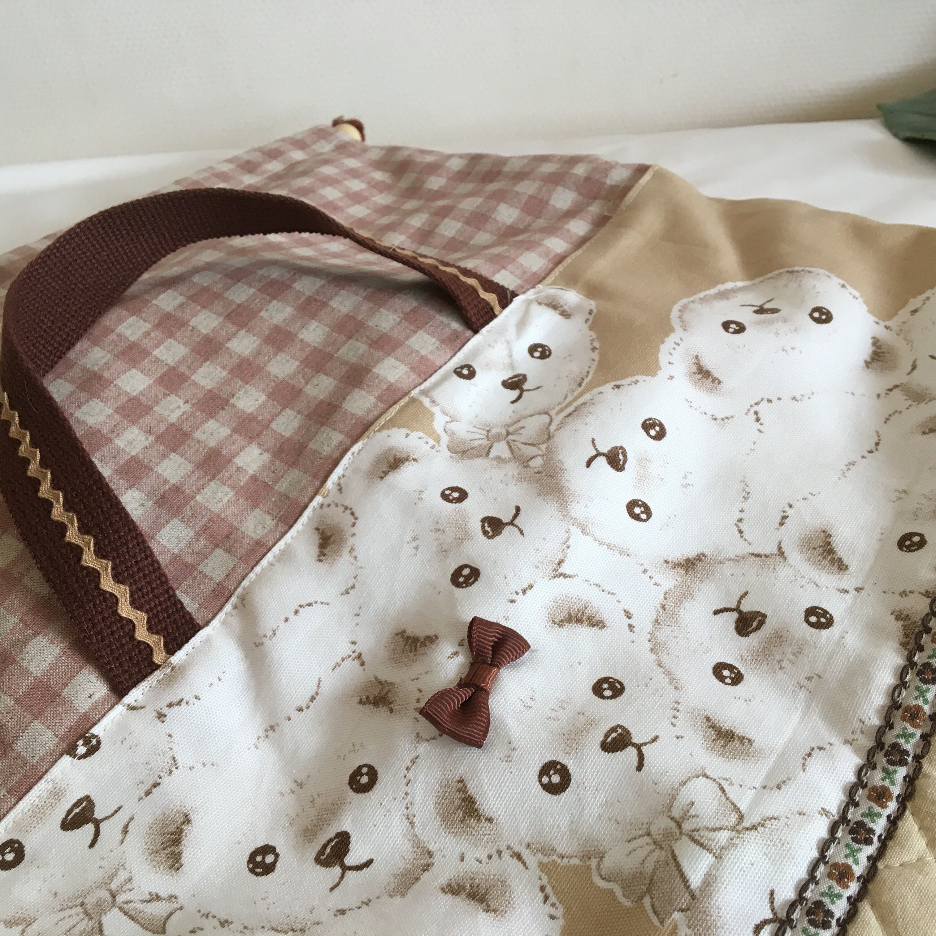 【素材】くまちゃんPT、チェックくすみピンク、キルティングベージュ、ブレード・くまちゃんにリボンなどで飾りました