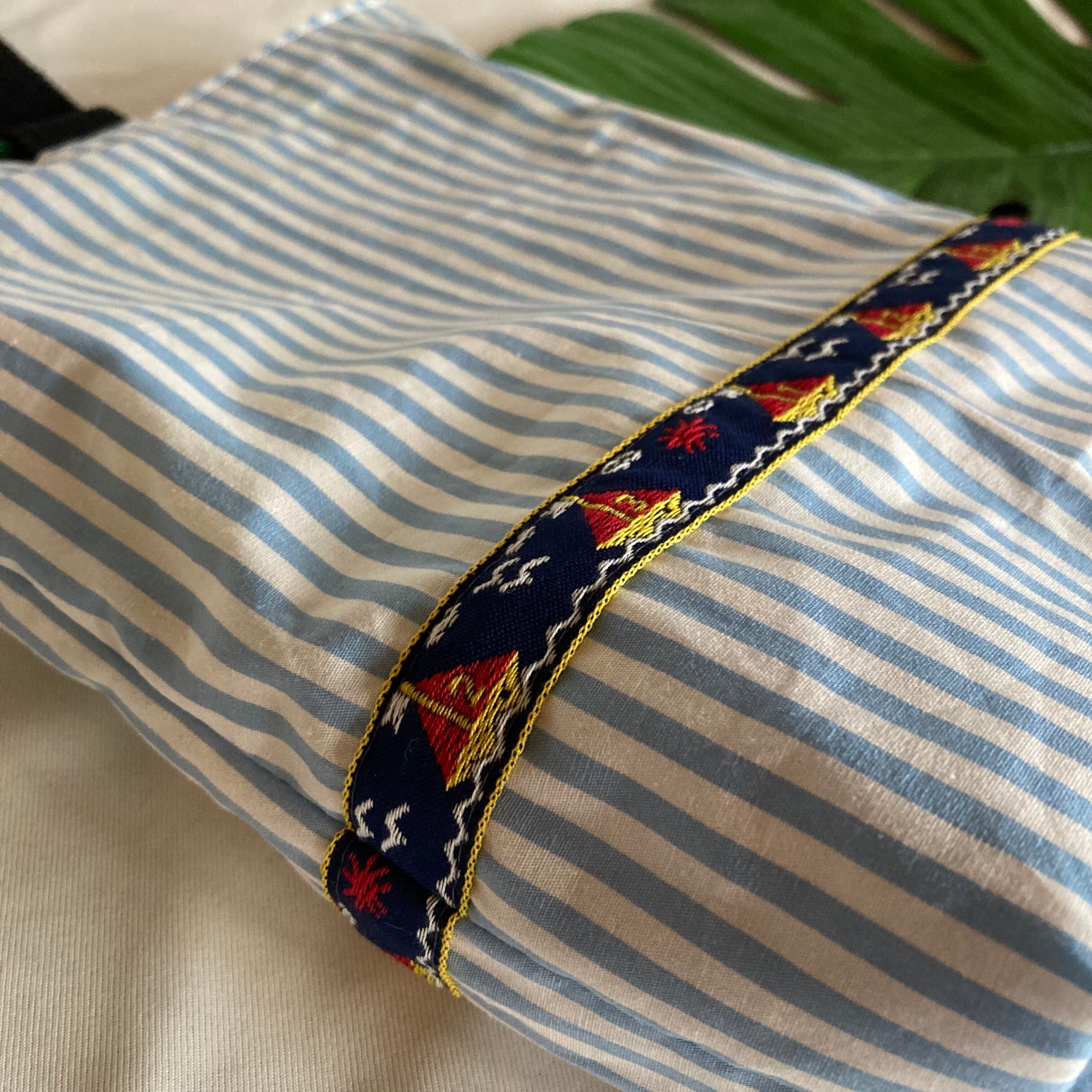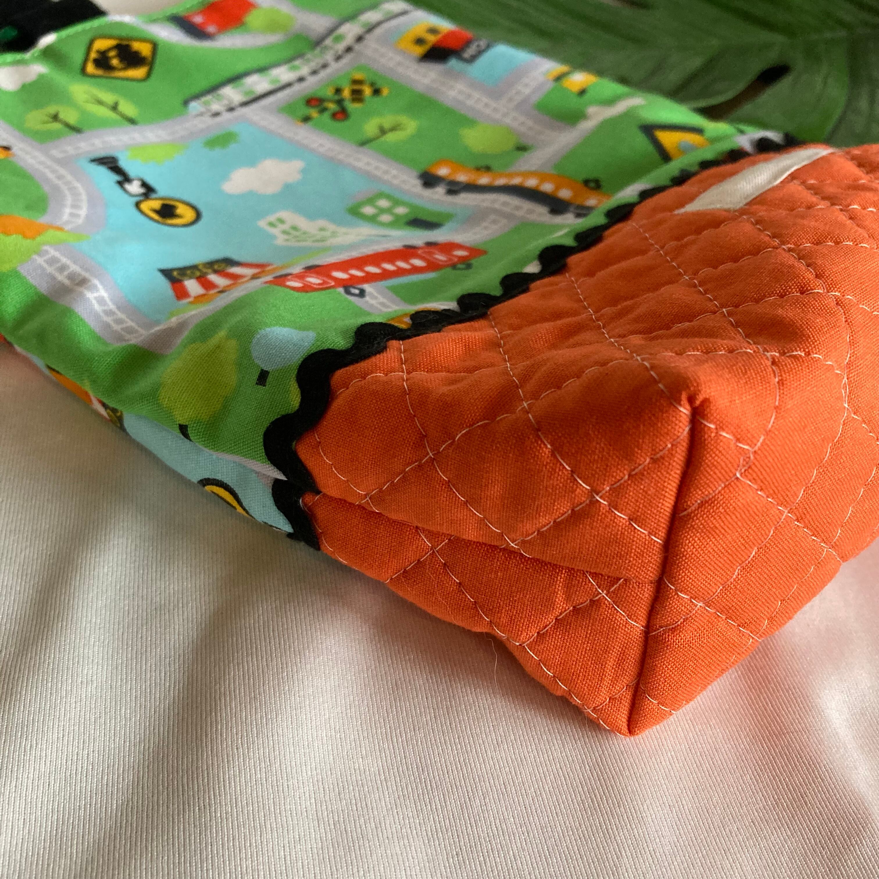 ●グリーン×オレンジ系→ 電車PT、ストライプ水色、キルティングオレンジ、ブレードで飾りました