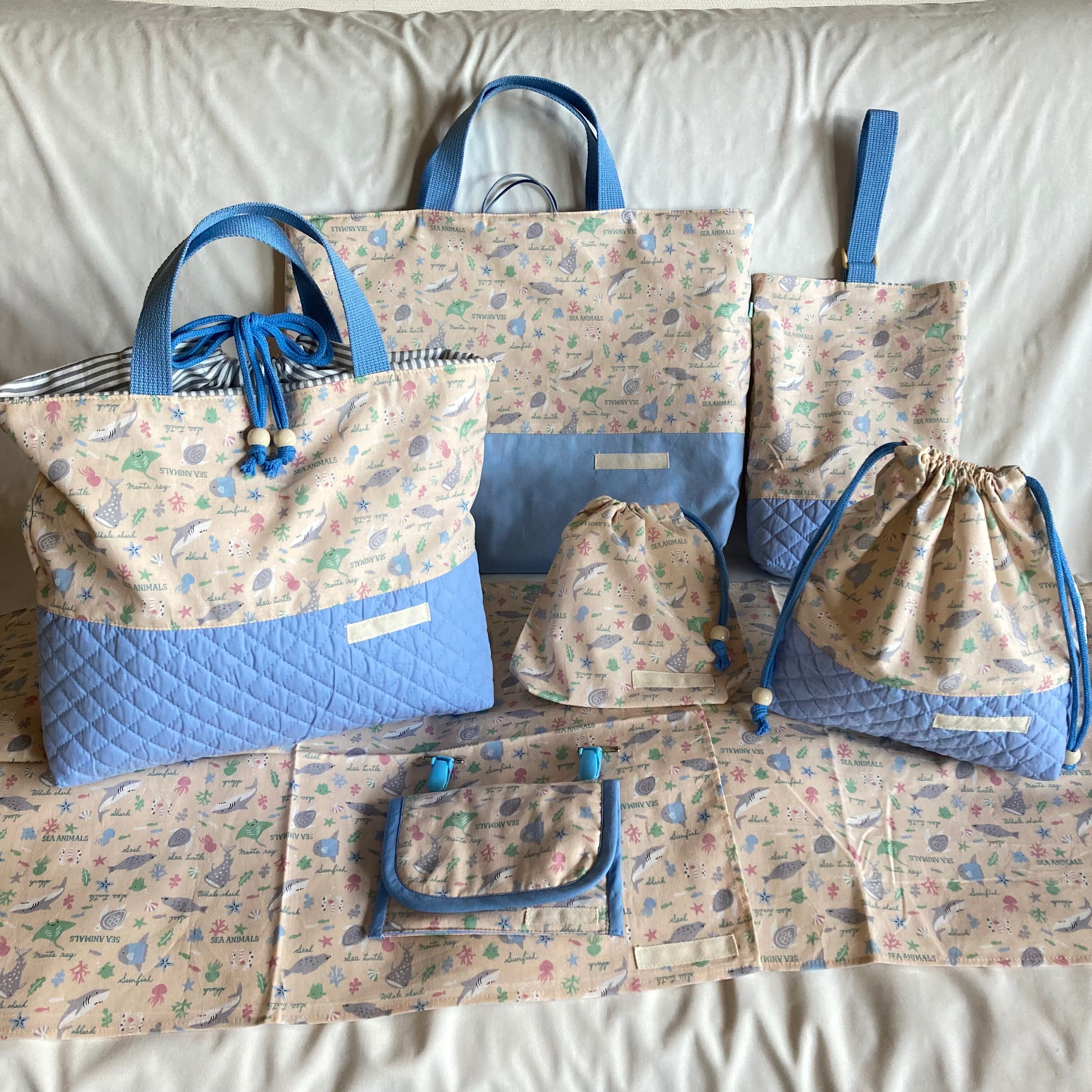 ランドセルの上から背負える!ナップサックナップザック持ち手つき巾着★39くすみニュアンスパステル水族館★入園入学海の生き物サメいるかクジラタコ魚カメエイマンタチンアナゴパステル体操着着替え習い事