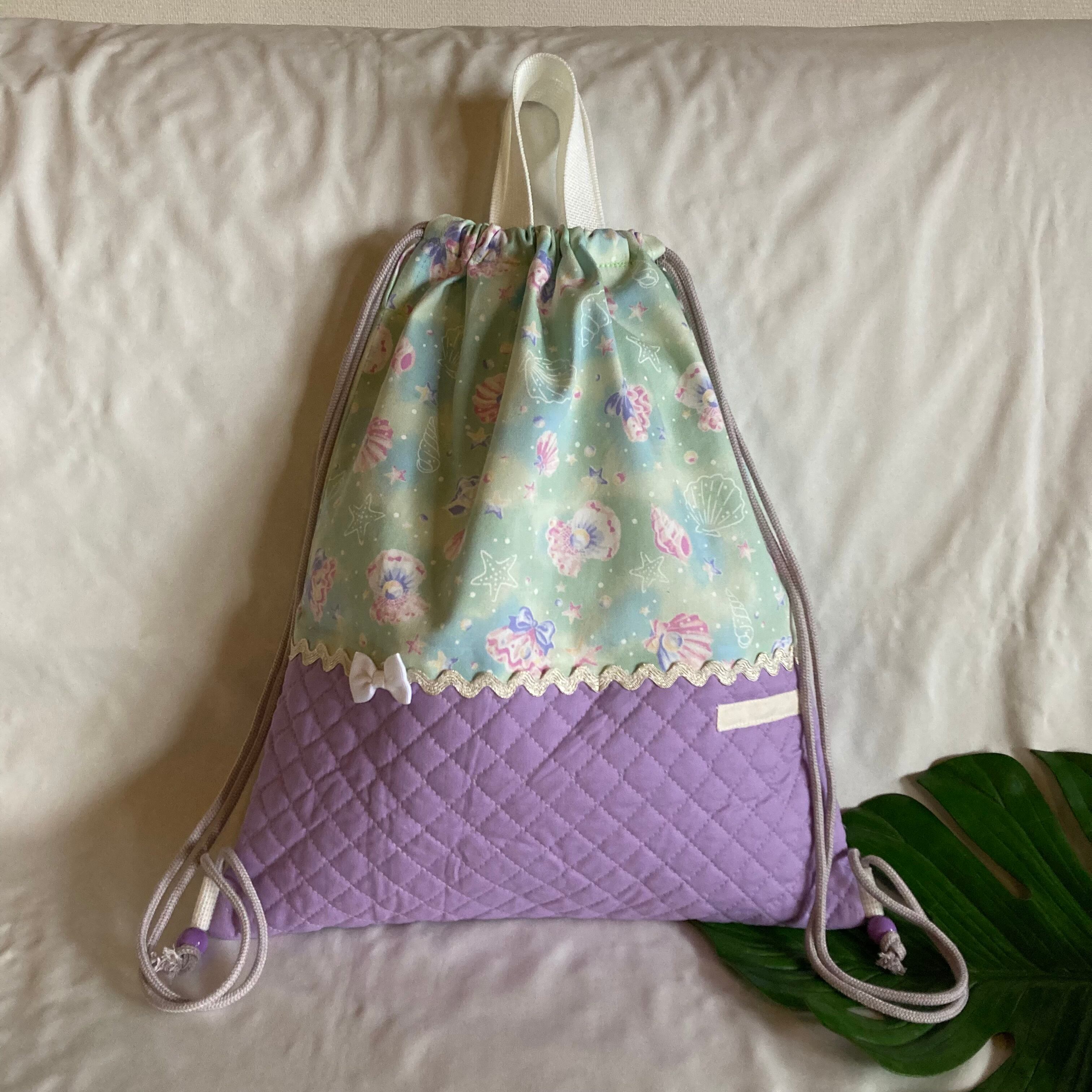 ランドセルの上から背負える!ナップサックナップザック持ち手つき巾着★56貝シェルきらきらパール★入園入学くすみニュアンスパステルキルティング切替持ち手お出かけ