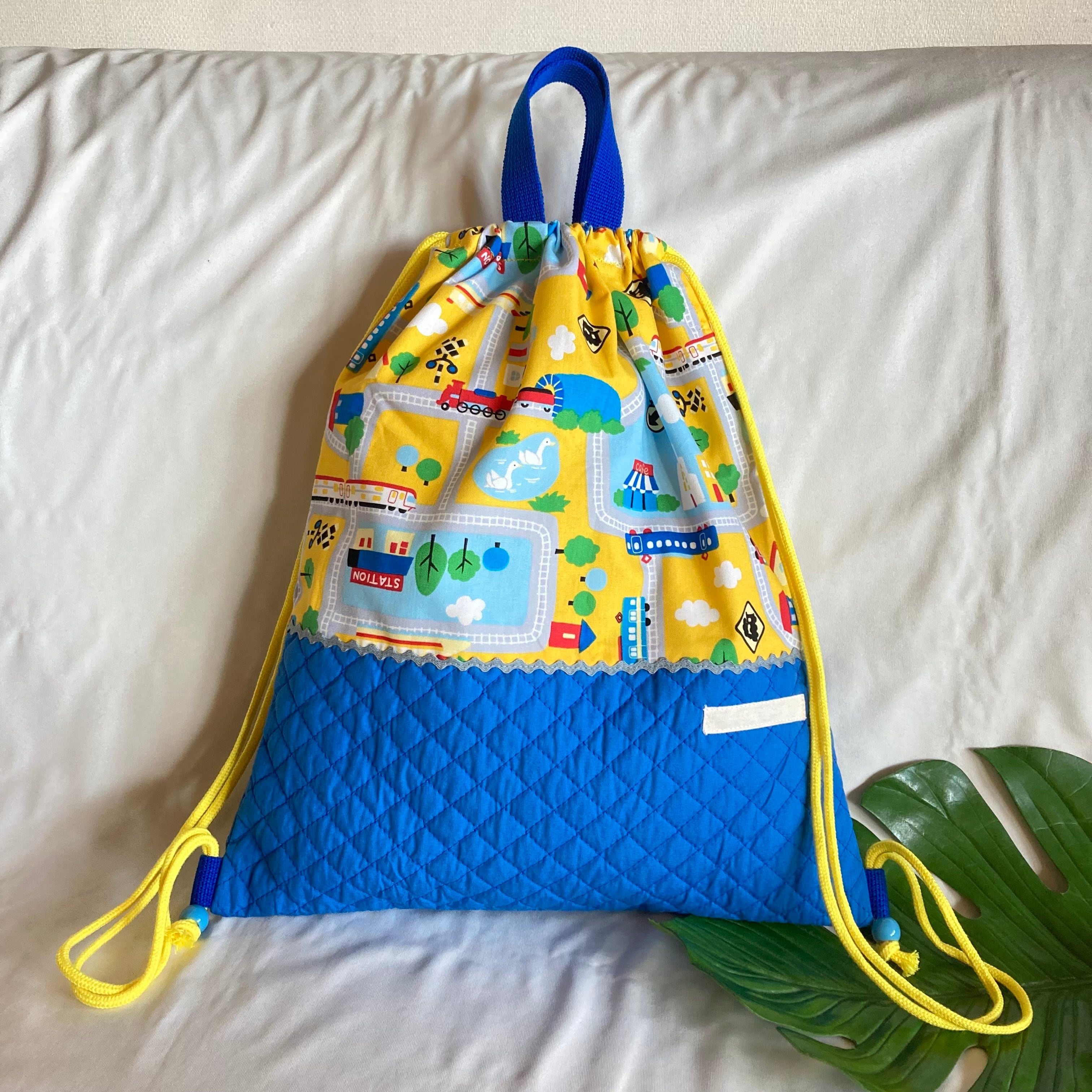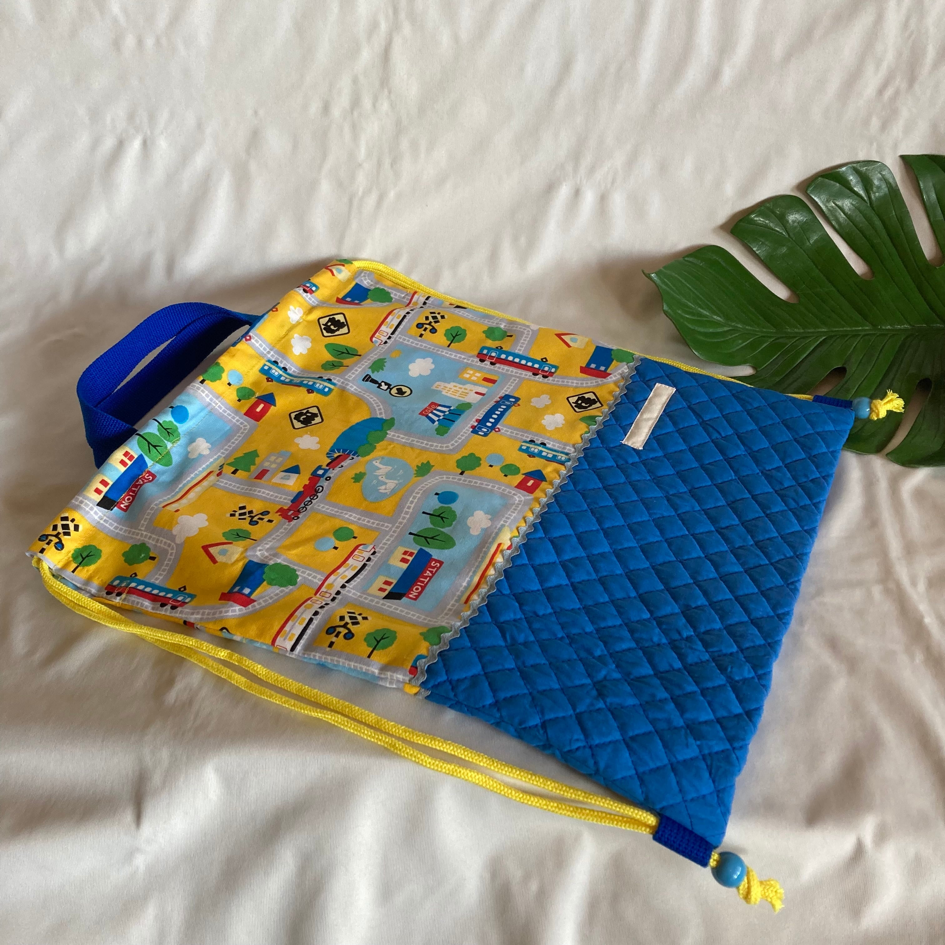 ランドセルの上から背負える!ナップサックナップザック持ち手つき巾着★63電車汽車が通る町線路★入園入学踏切交通標識ドクターイエローキルティング名前持ち手