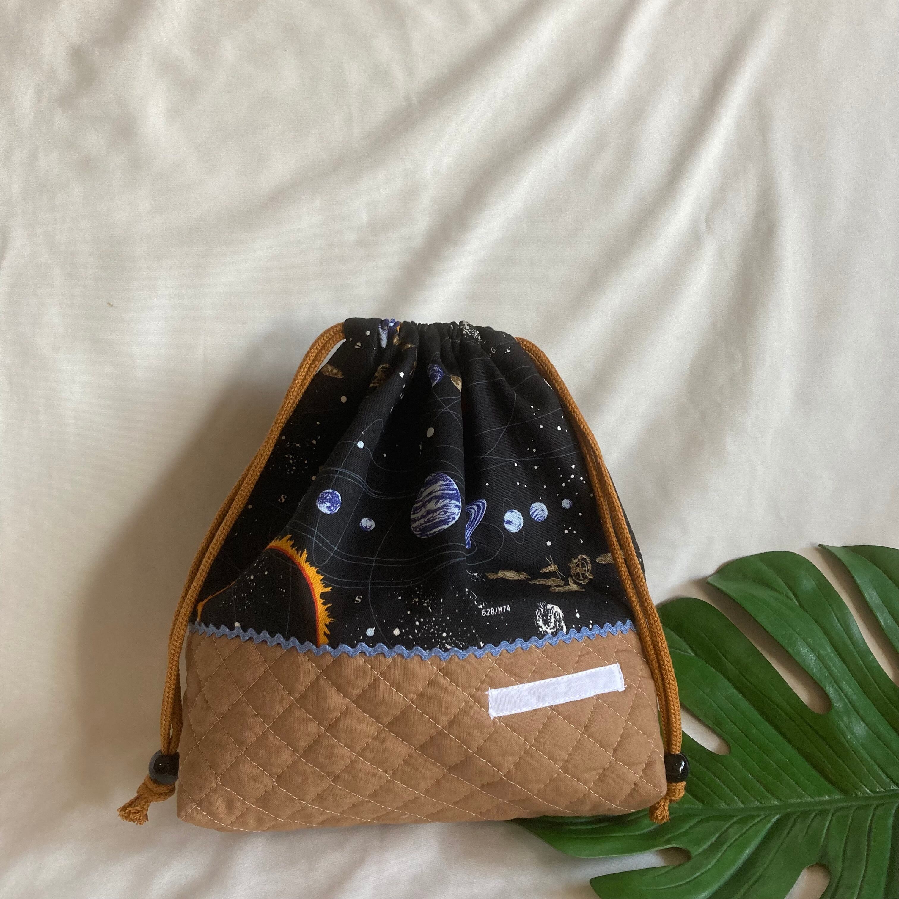 入園入学ランチバッグお弁当入れ巾着26宇宙銀河スペース星座惑星地球スペースシャトルロケットキルティングマチ持ち手名前小学校幼稚園男の子黒グレーくすみニュアンスパステル