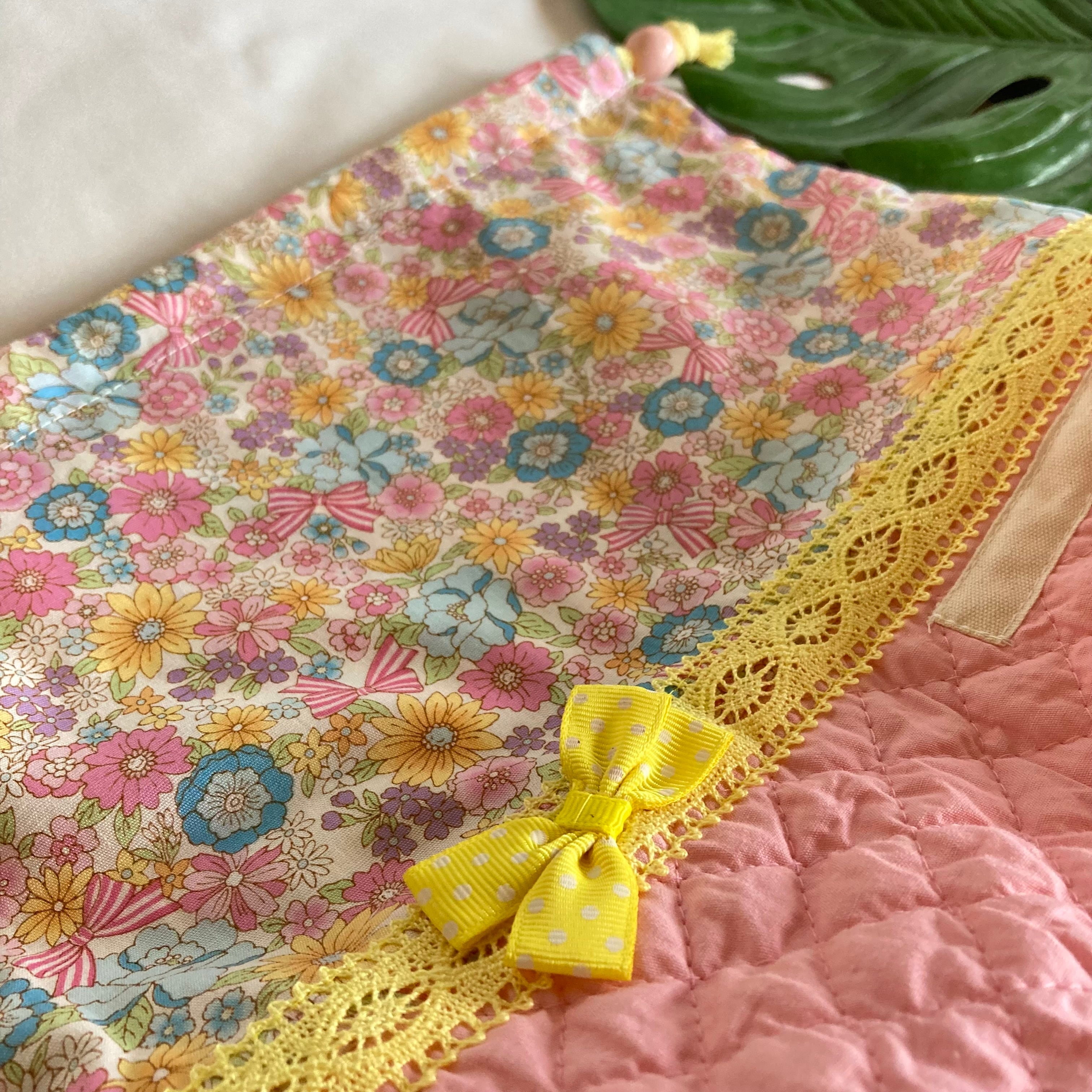 【オーダーOK】入園入学ランチバッグお弁当入れマチつき巾着45お花とリボン★縫い付けお名前小学校キルティングマチ★ラッピングプレゼント誕生日クリスマスリボンレースくすみニュアンス
