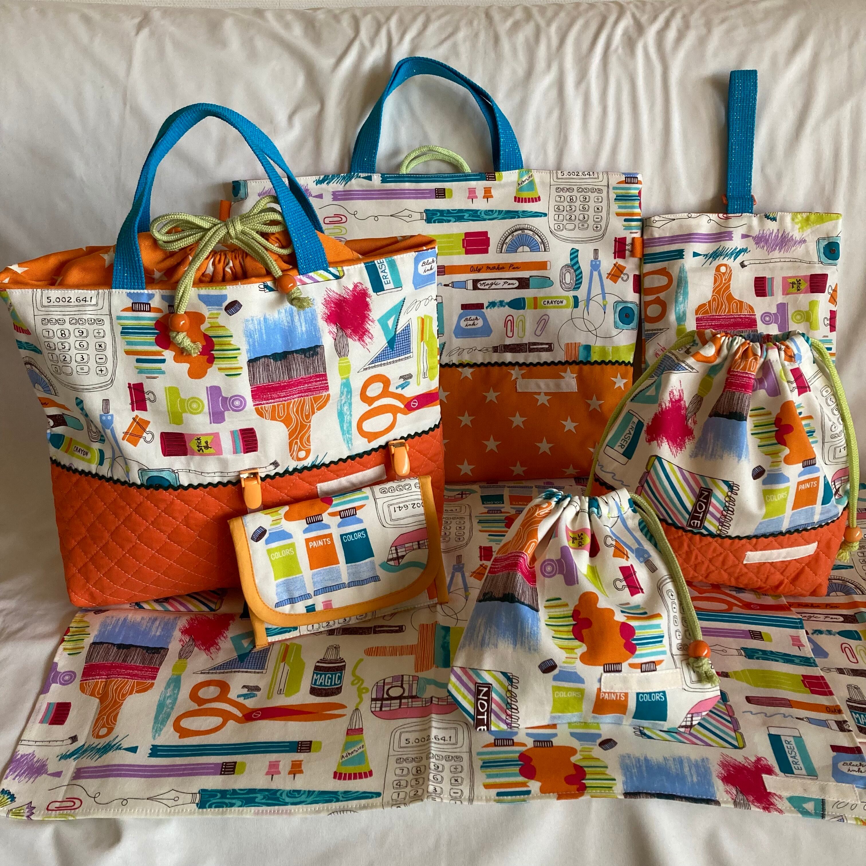 【オーダーOK】入園入学セット04カラフル文房具W★手提げ上履き給食お着替え巾着ランチョンマット移動ポケットナップサックナップザックキルティングマチ持ち手学校