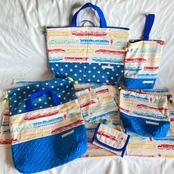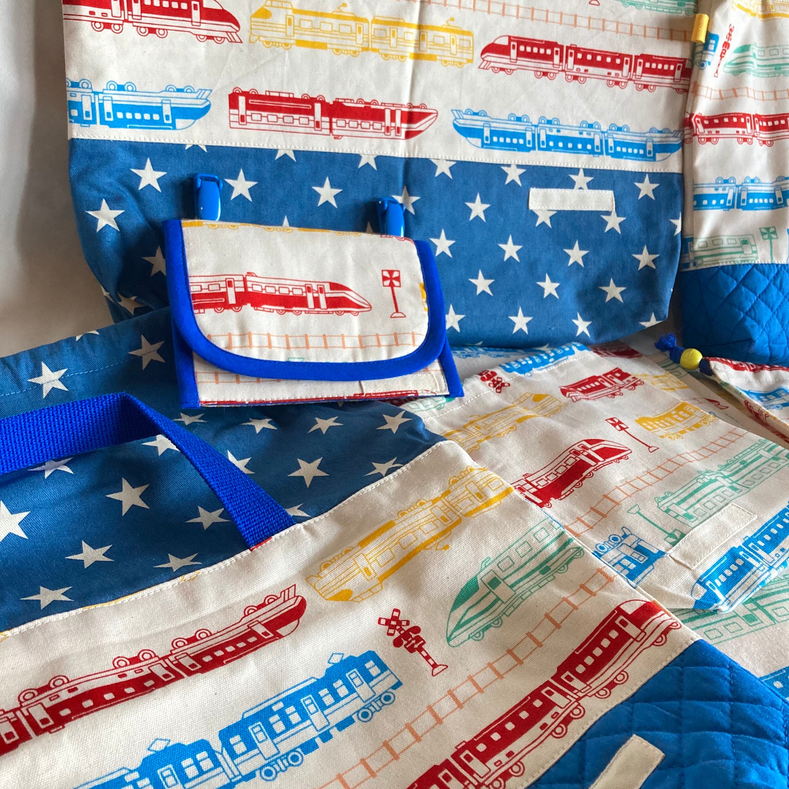 【オーダーOK】入園入学セット35電車踏切線路カラフルポップW★手提げ上履き給食お着替え巾着ランチョンマット移動ポケットナップザック