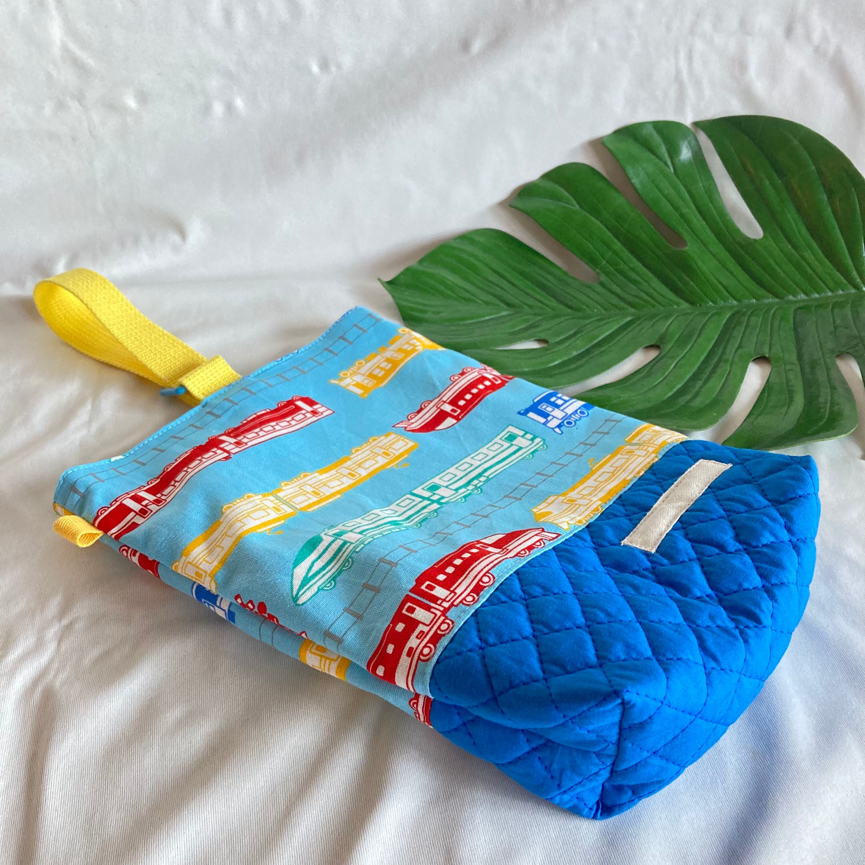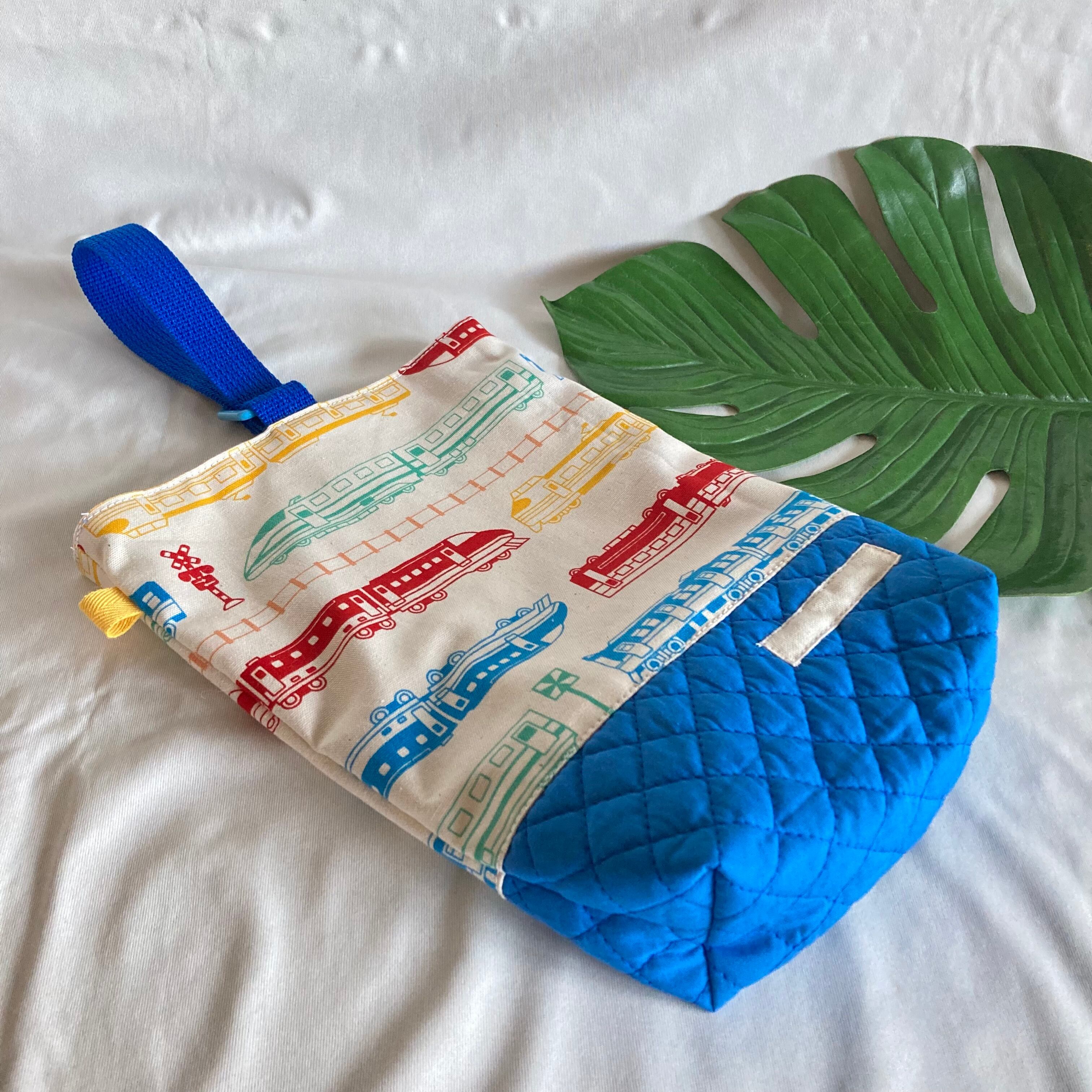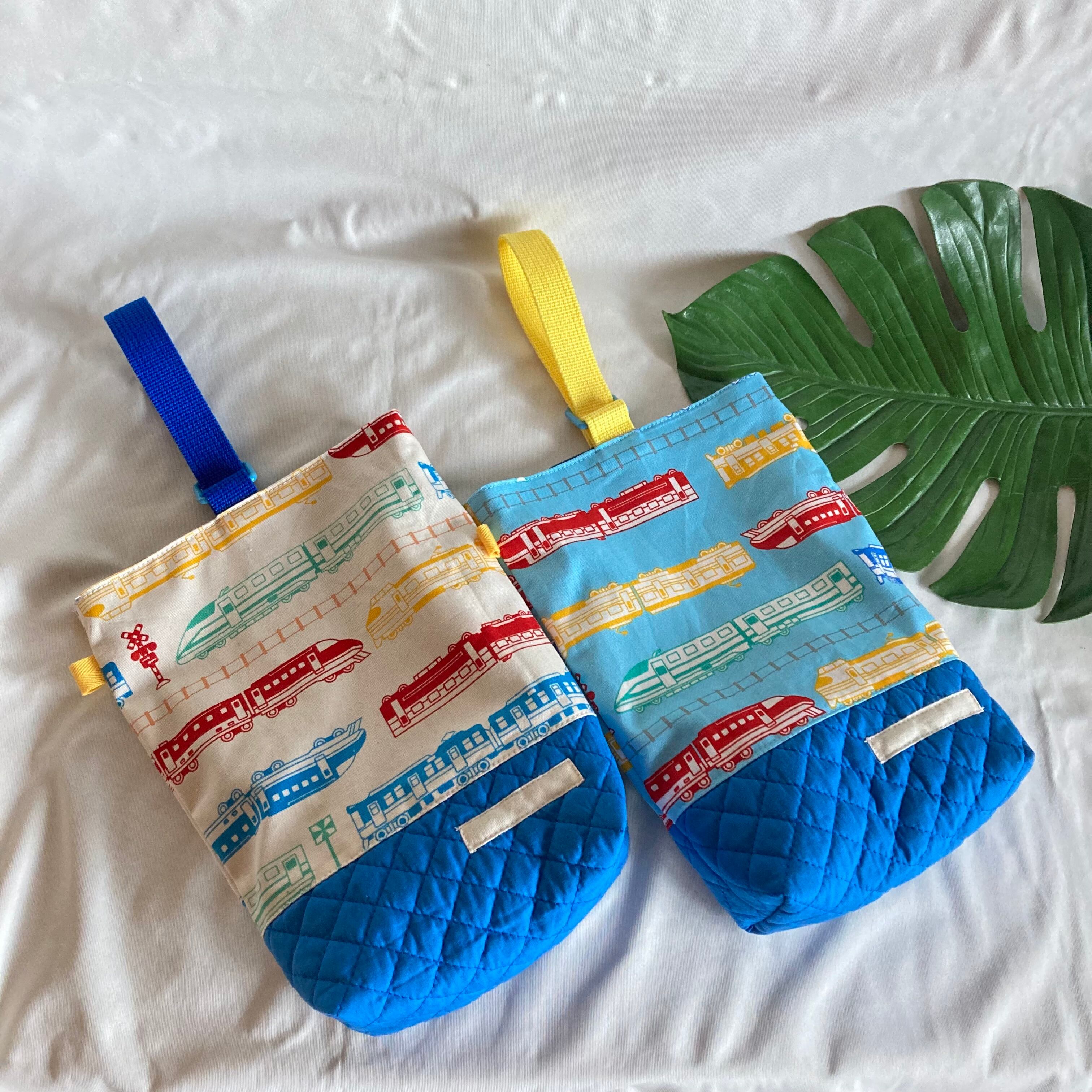 【オーダーOK】入園入学シューズケース上履き袋リバーシブル上靴35電車踏切線路特急新幹線カラフルポップ★縫い付けお名前小学校マチキルティング★ラッピングプレゼント誕生日クリスマスDカン持ち手