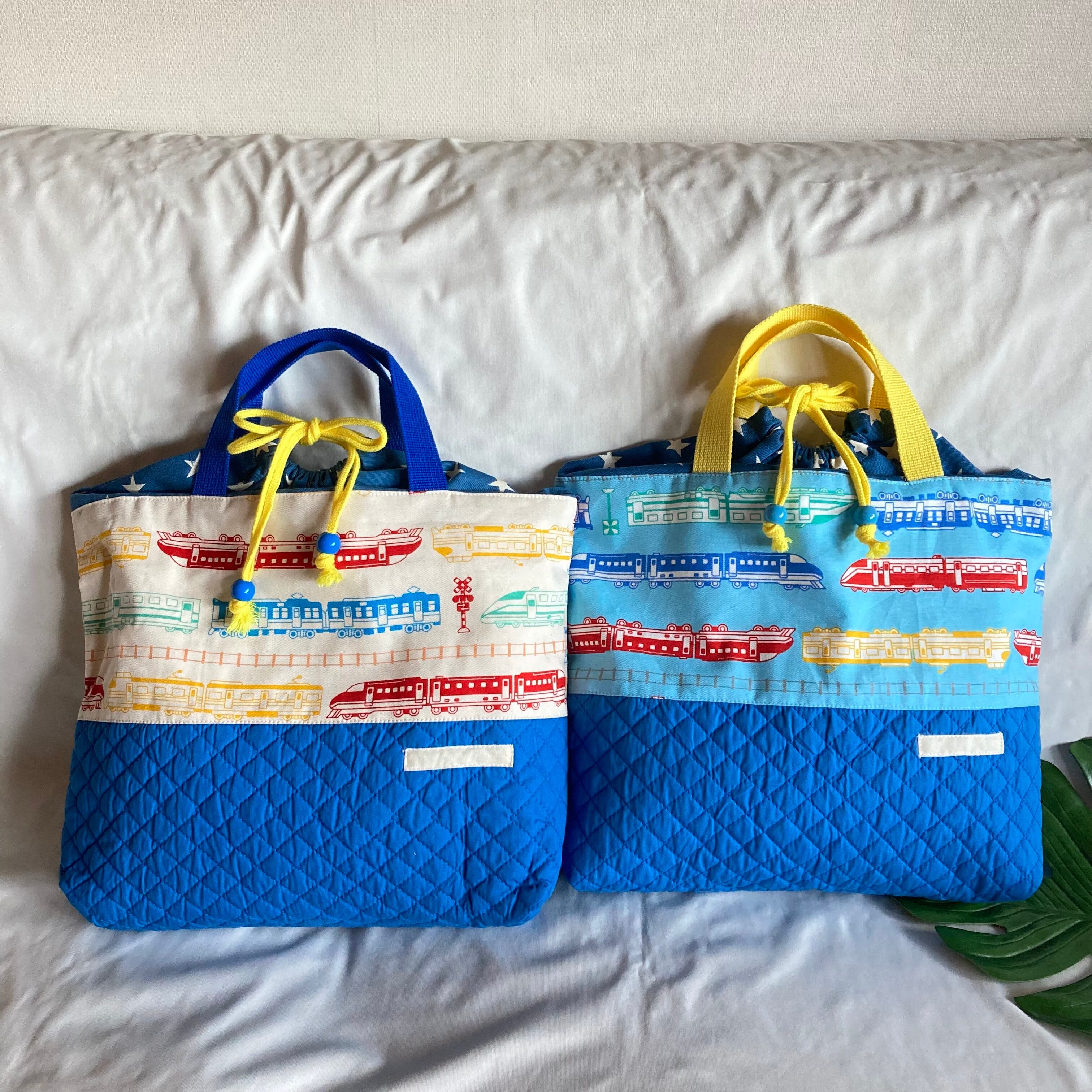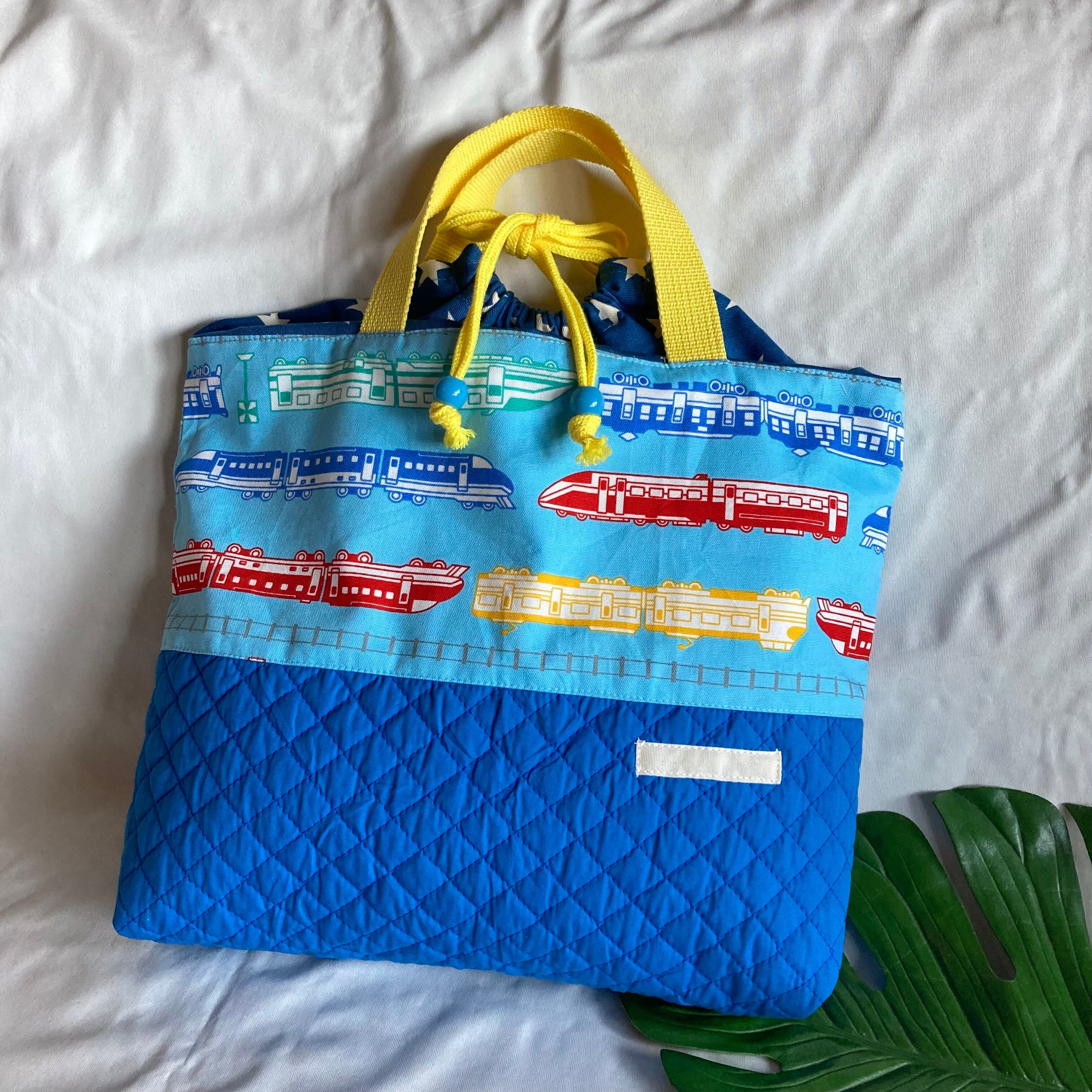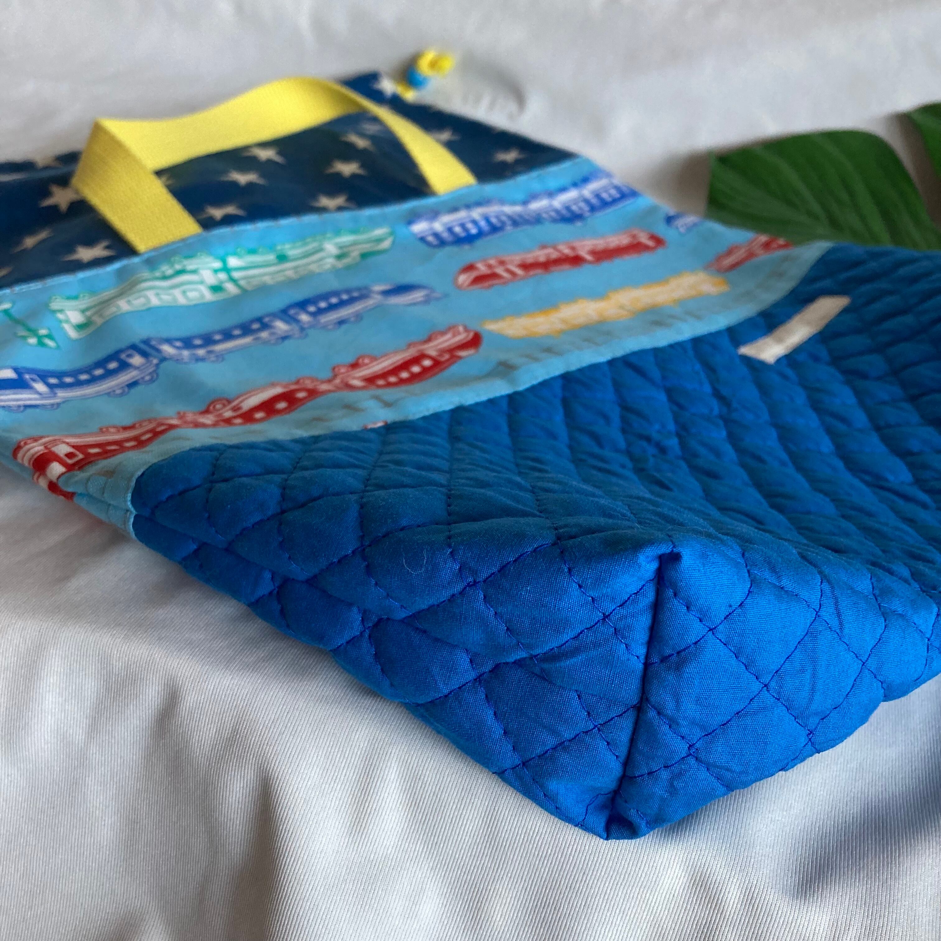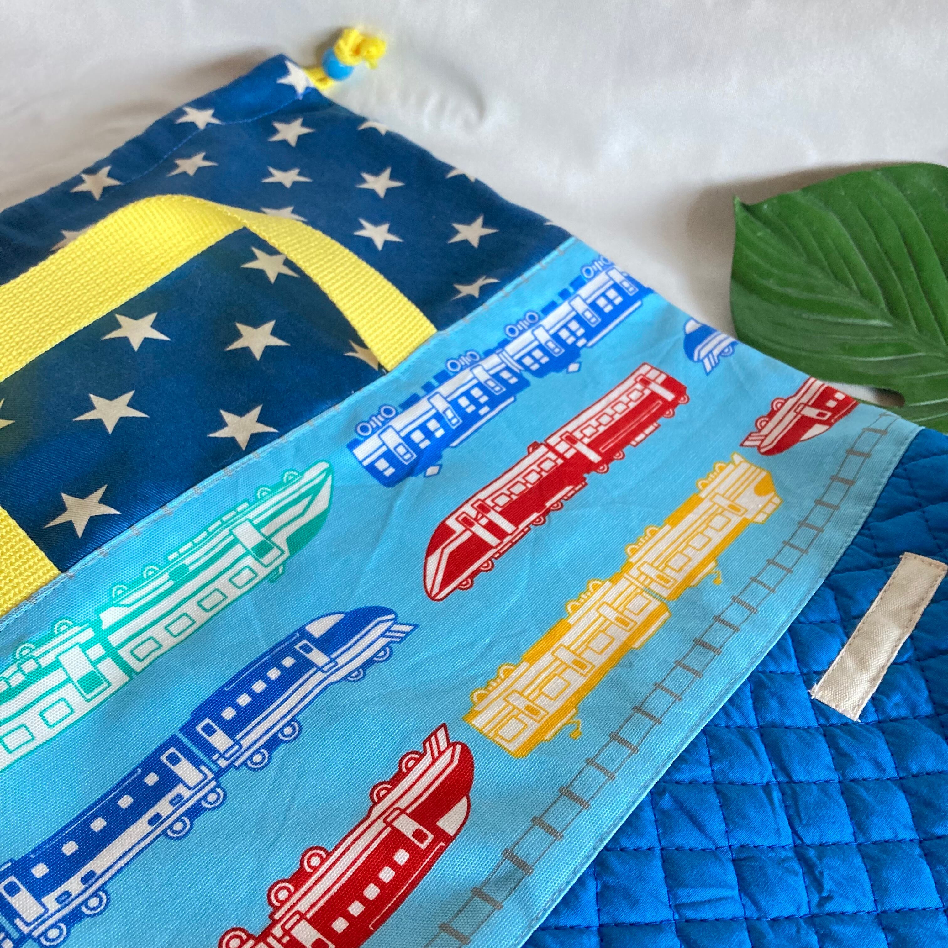 【オーダーOK】入園入学体操着お着替え袋持ち手内袋裏地巾着35電車踏切線路特急新幹線カラフルポップ★縫い付けお名前小学校マチキルティング★ラッピングプレゼント誕生日クリスマス男の子