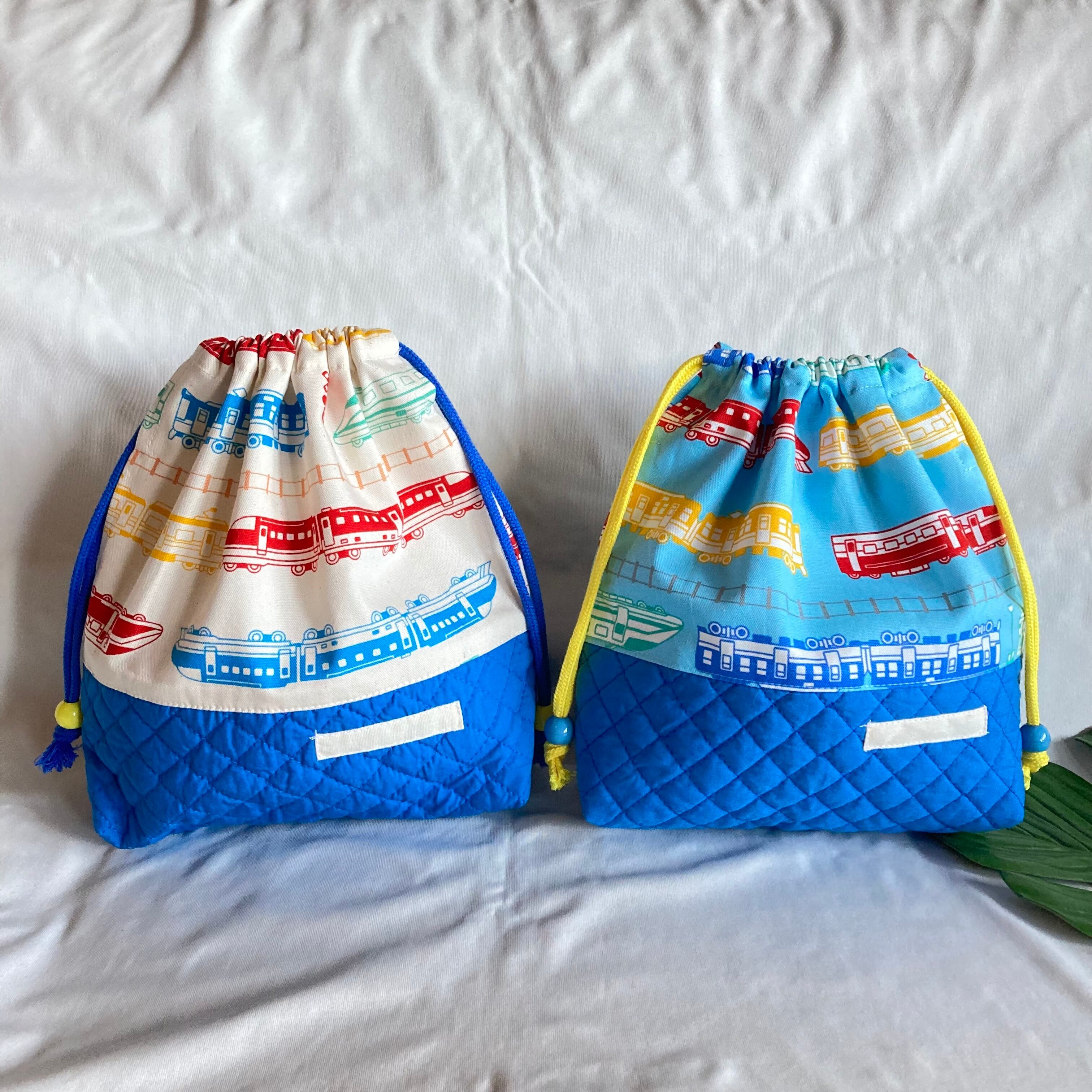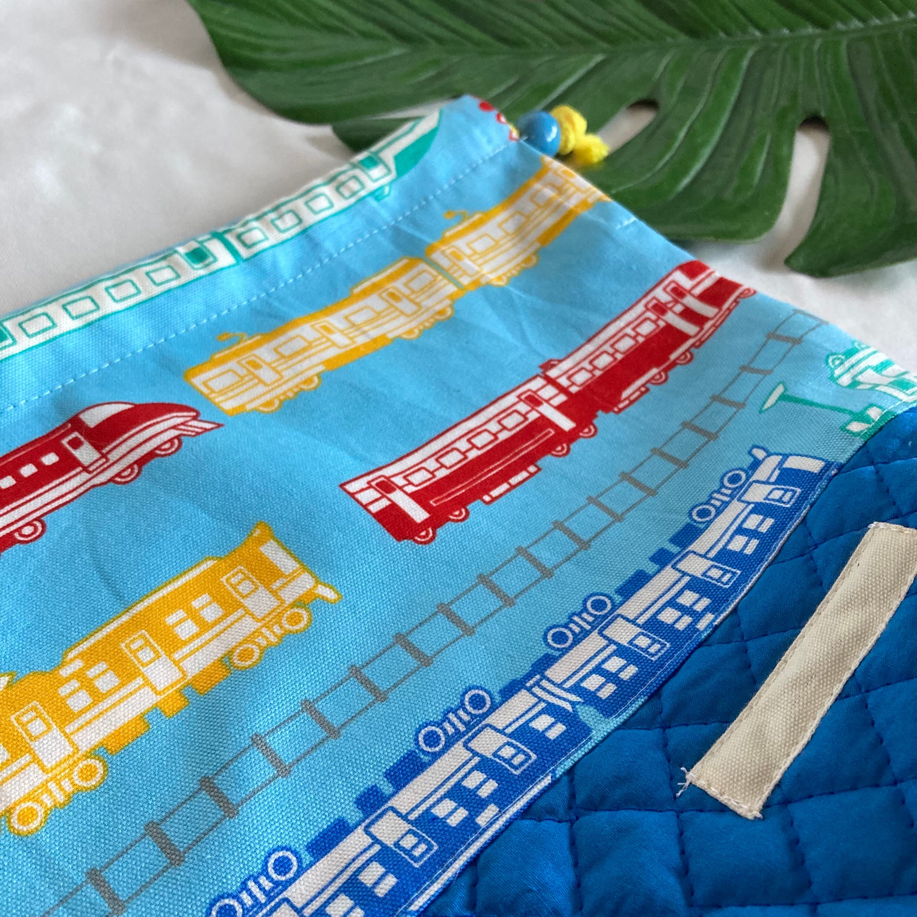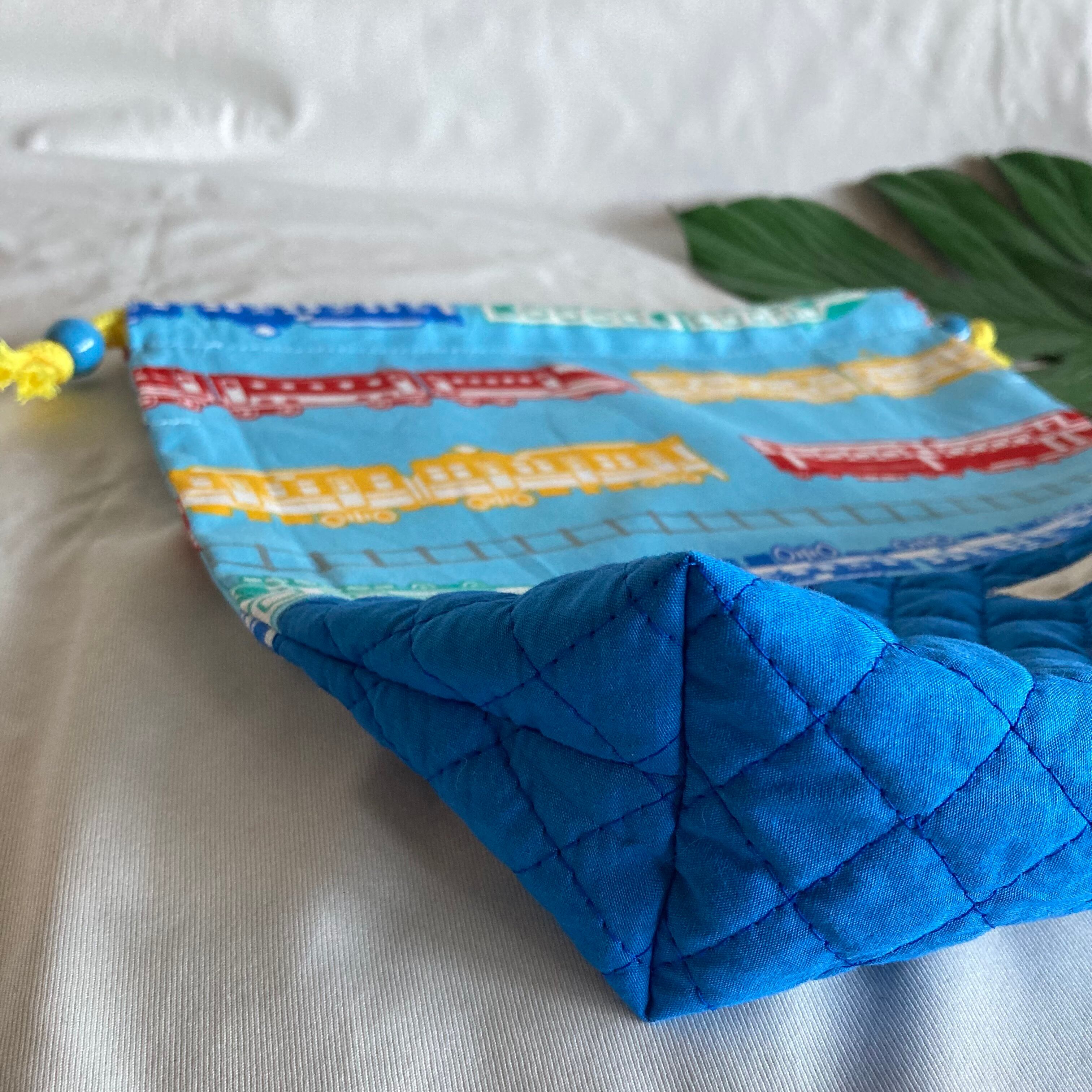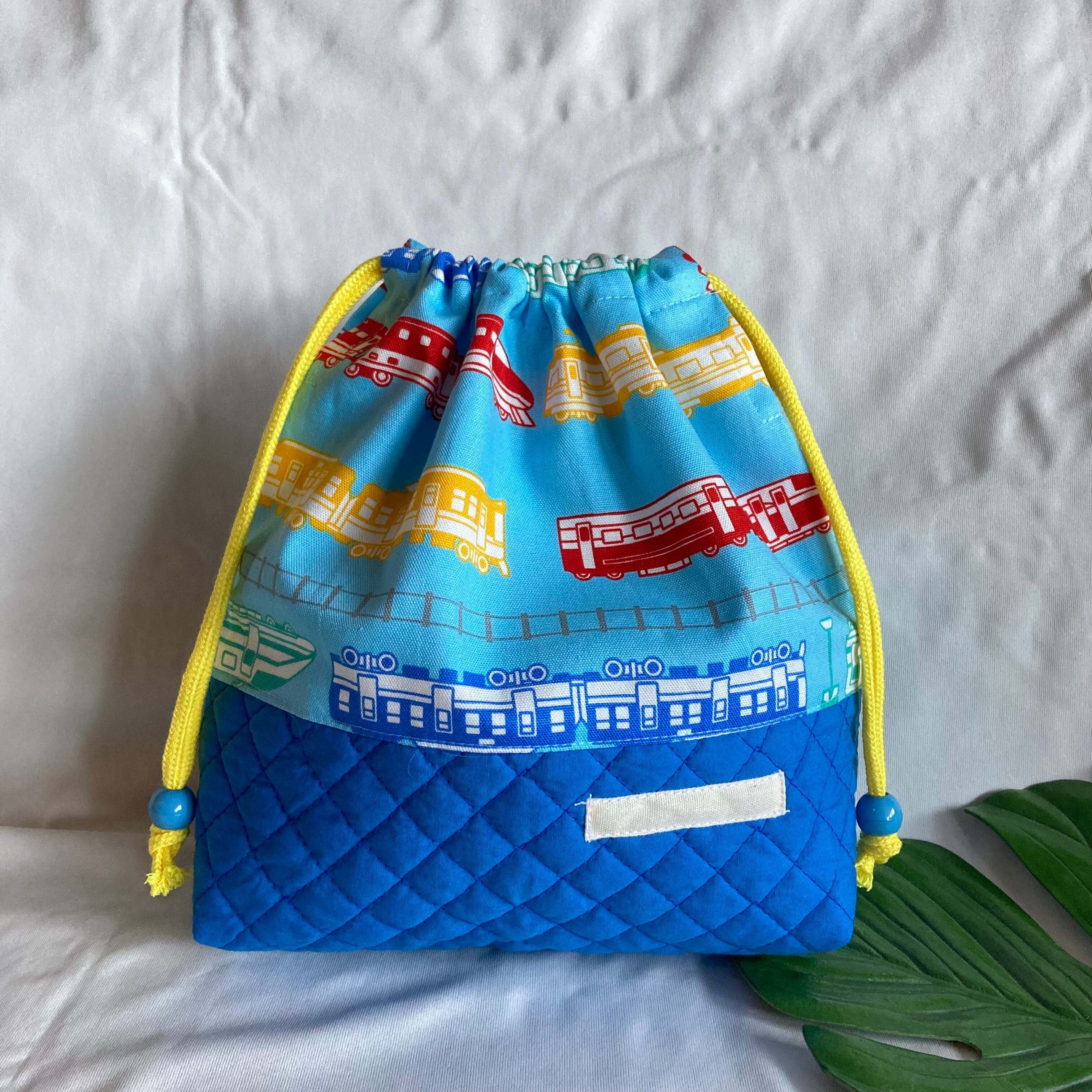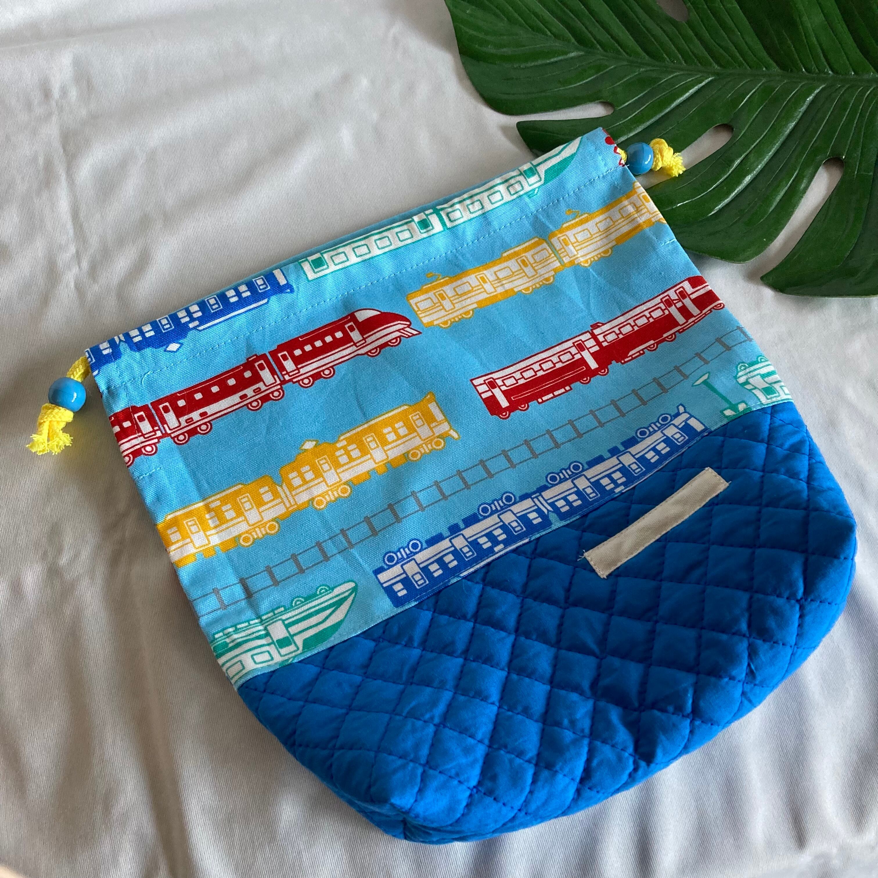 【オーダーOK】入園入学ランチバッグお弁当入れマチつき巾着35電車踏切線路特急新幹線カラフルポップ★縫い付けお名前小学校マチキルティング★ラッピングプレゼント誕生日クリスマス男の子