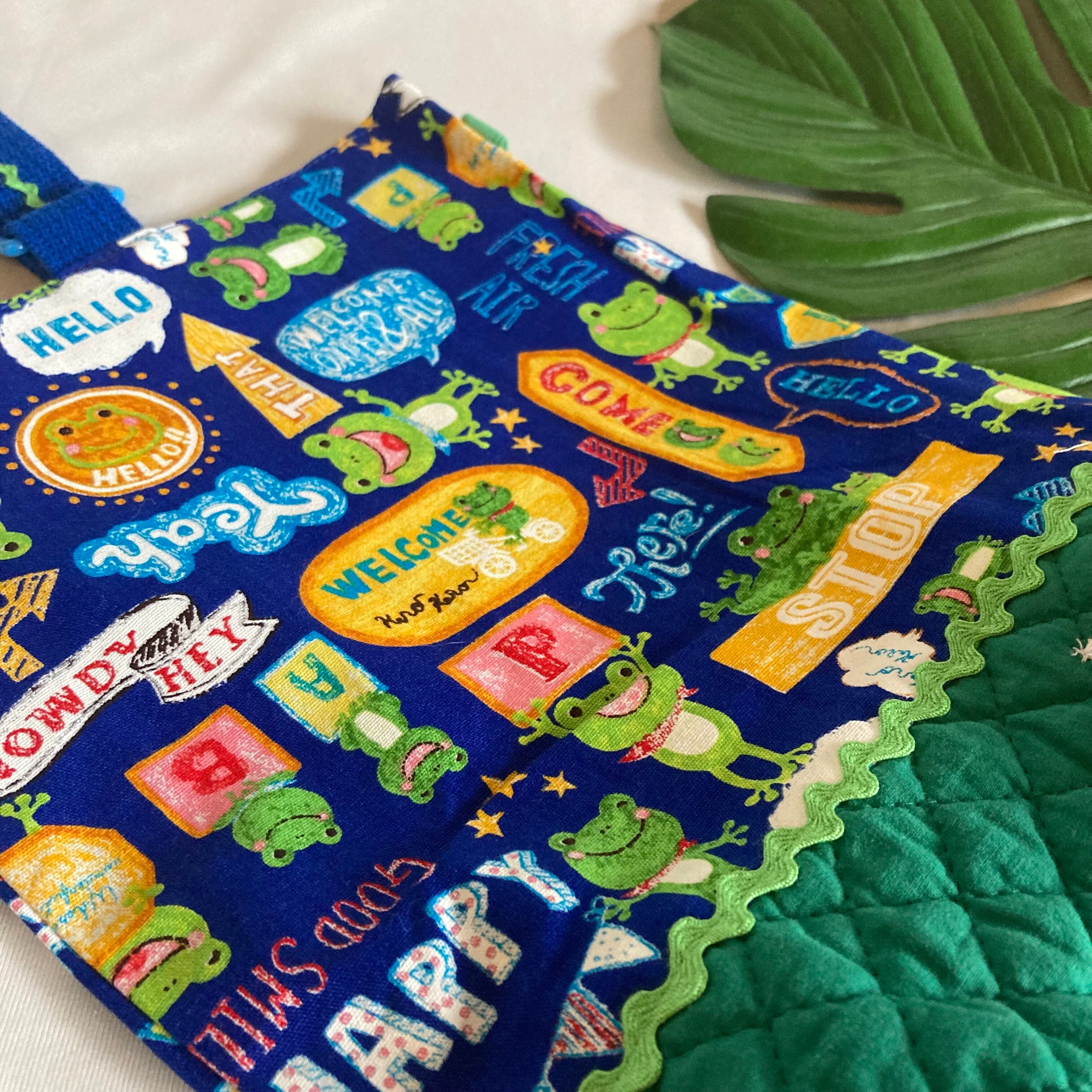 【素材】かえるPT、ピンストライプ、キルティング緑、ブレードなどで飾りました。