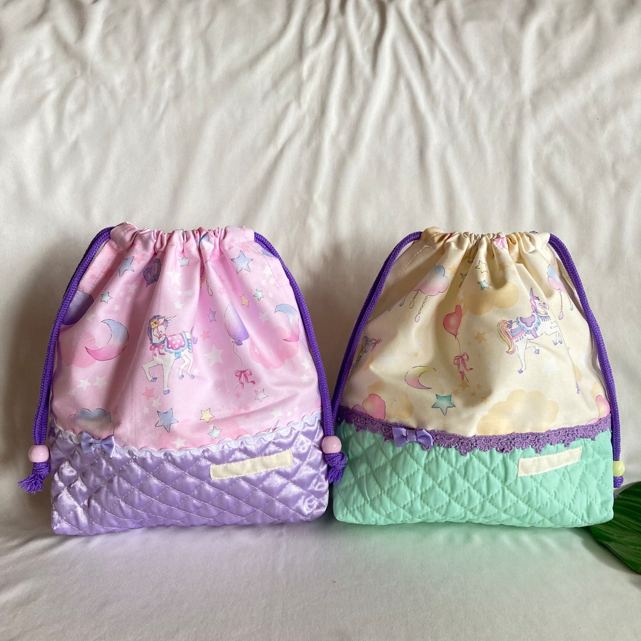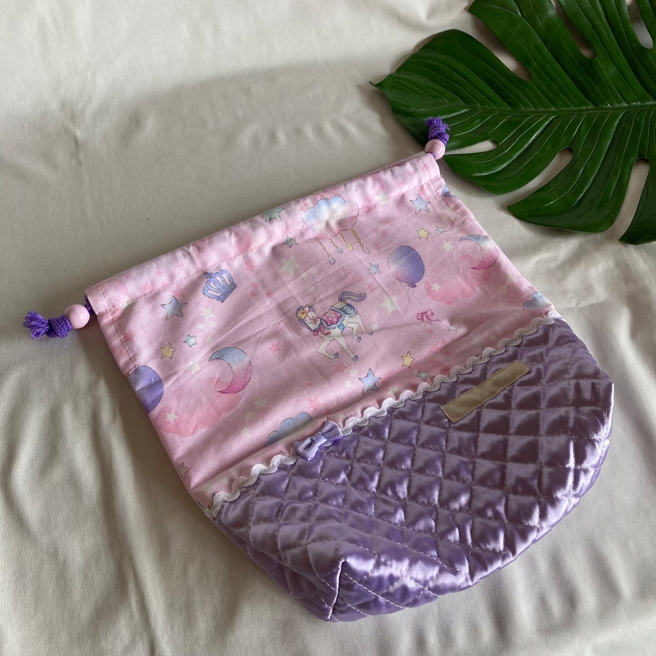 【オーダーOK】入園入学ランチバッグお弁当入れマチつき巾着16原宿ドールズファンタジーユニコーンくすみニュアンスパステル女の子リボンレースメリーゴーランド