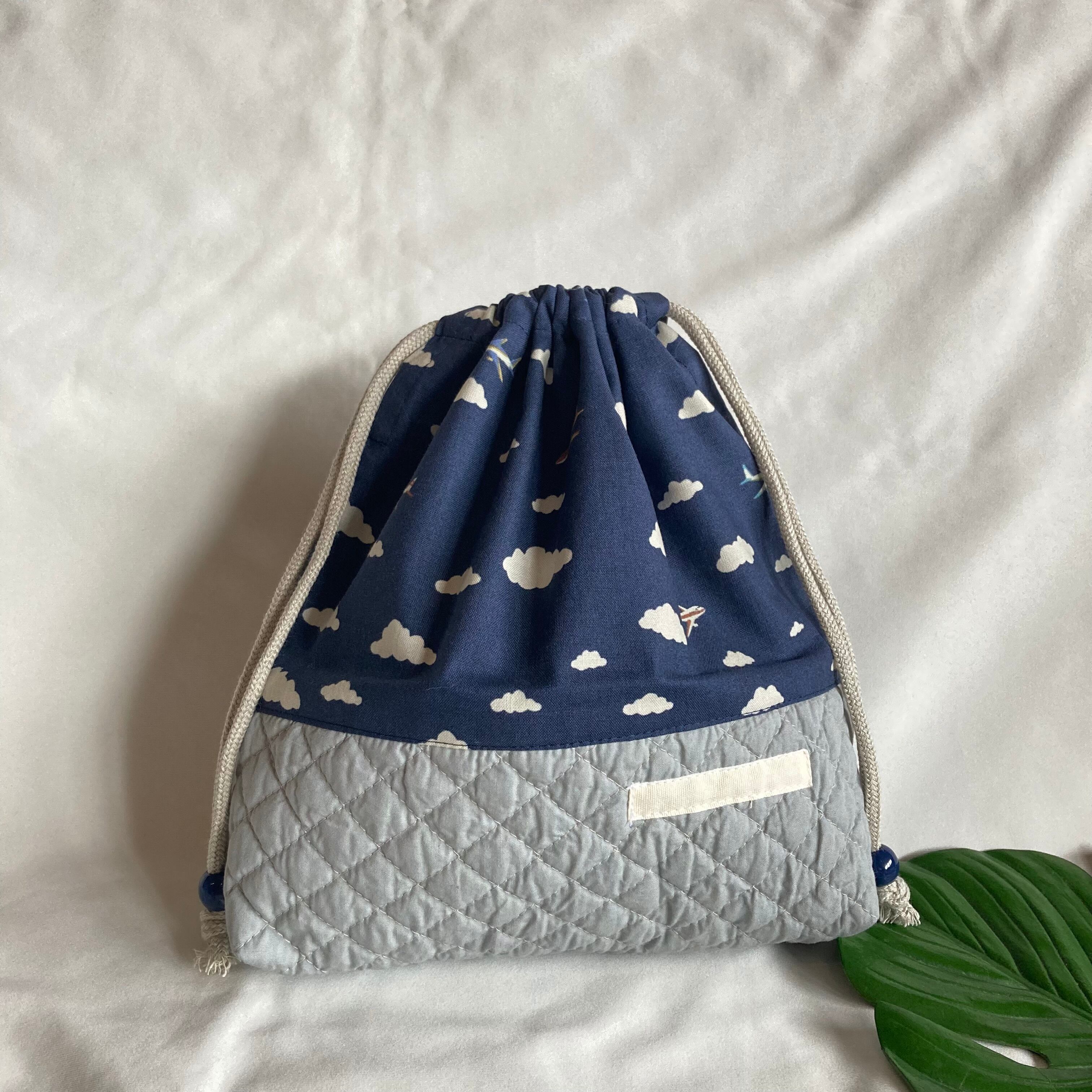 【オーダーOK】入園入学ランチバッグお弁当入れ巾着★67飛行機と雲くすみニュアンス乗り物男の子マチ切り替えキルティングキルト