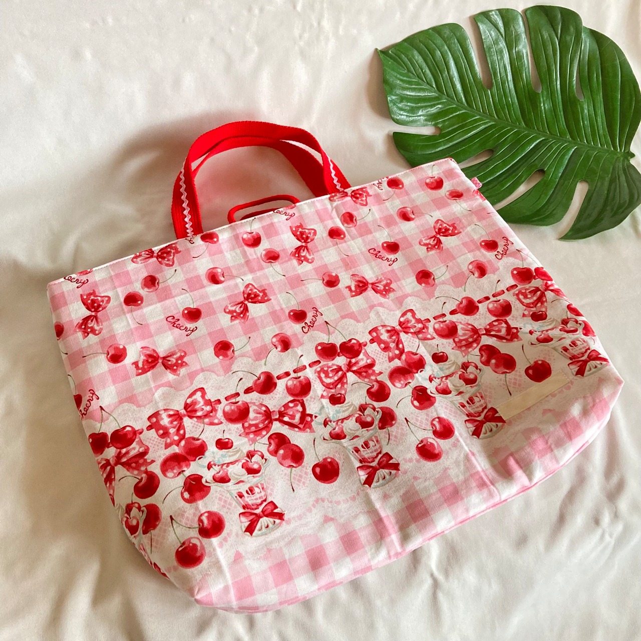 【床につかない!!】入園入学レッスンバッグ手提げ絵本袋リバーシブル★49チェリーさくらんぼパフェリボンスイーツフルーツくすみニュアンスパステル女の子リボンレース