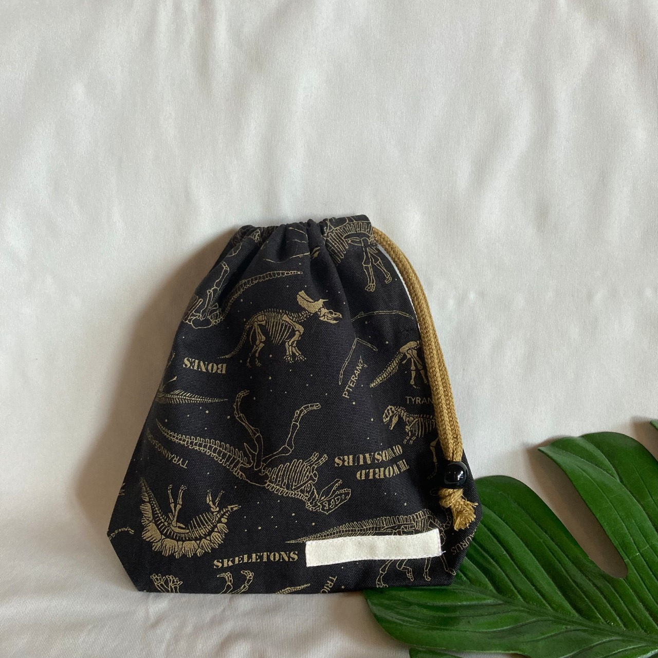 【オーダーOK】入園入学給食袋コップ入れ巾着65恐竜化石骨★縫い付けお名前小学校マチ片方から紐を引く巾着