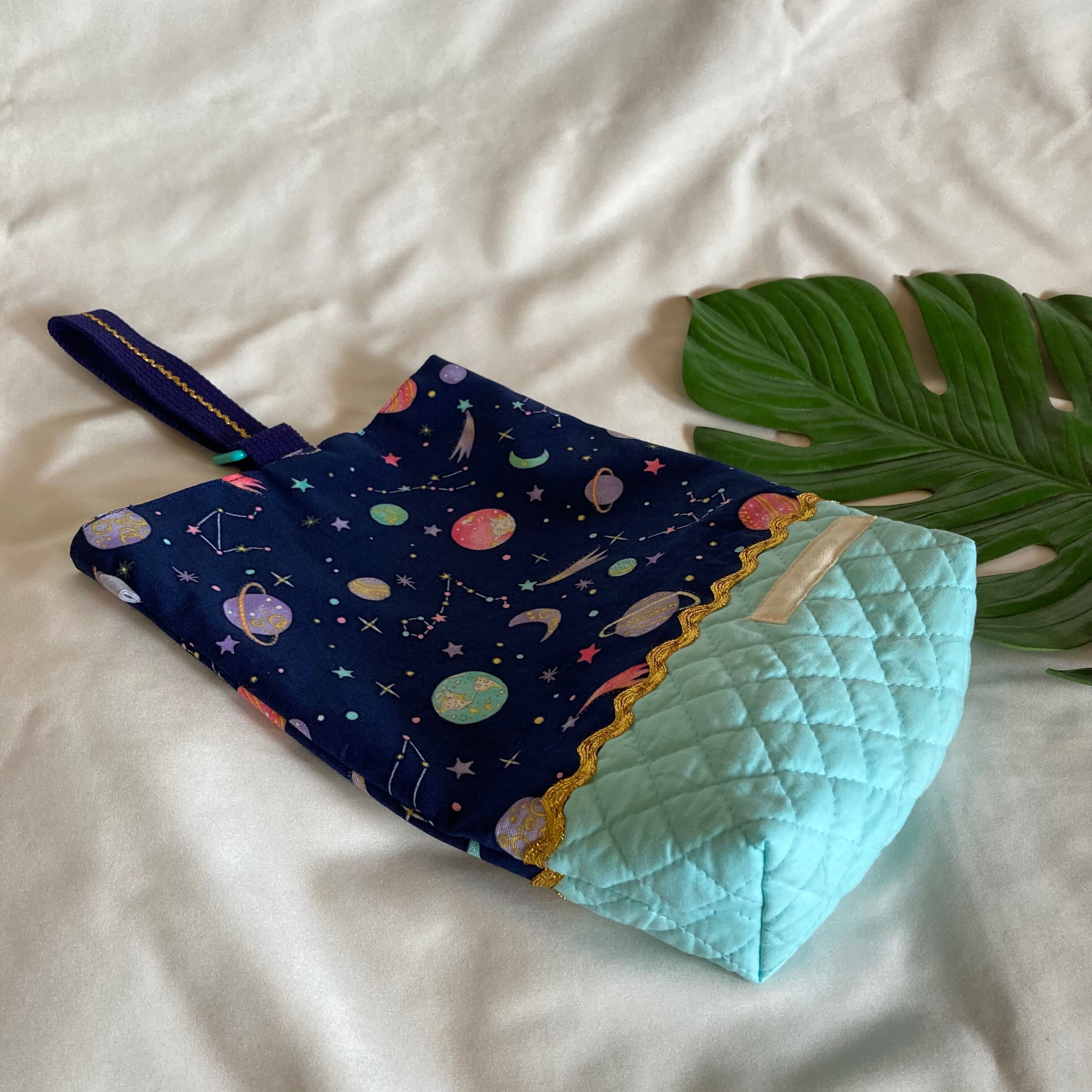 【素材】宇宙PT、むら染めパステル水色、キルティングパステル水色、きらきらブレードで飾りました★
