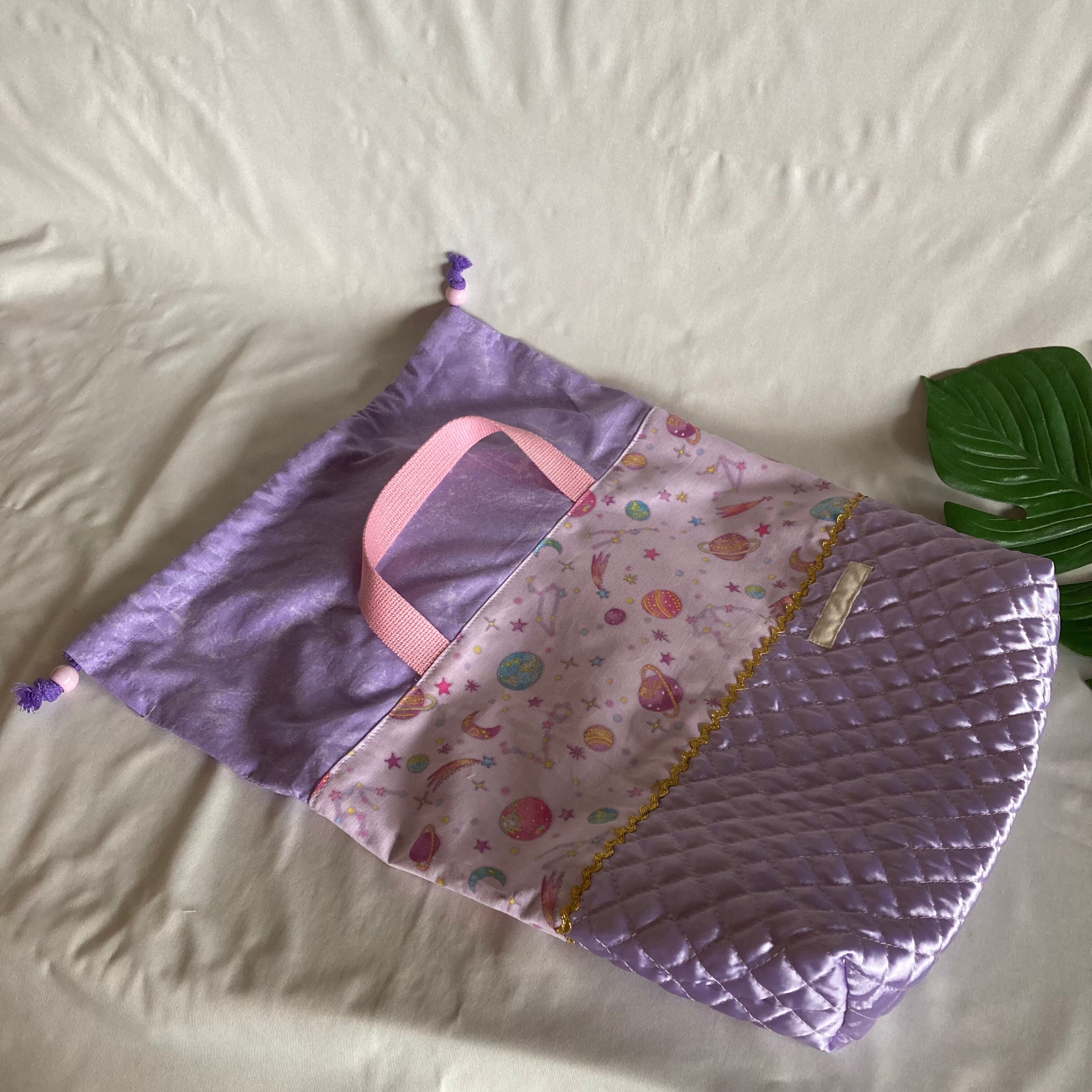 【オーダーOK】入園入学体操着お着替え袋内袋持ち手つき巾着★33きらきらラメの宇宙惑星銀河くすみニュアンスパステル女の子リボンレース