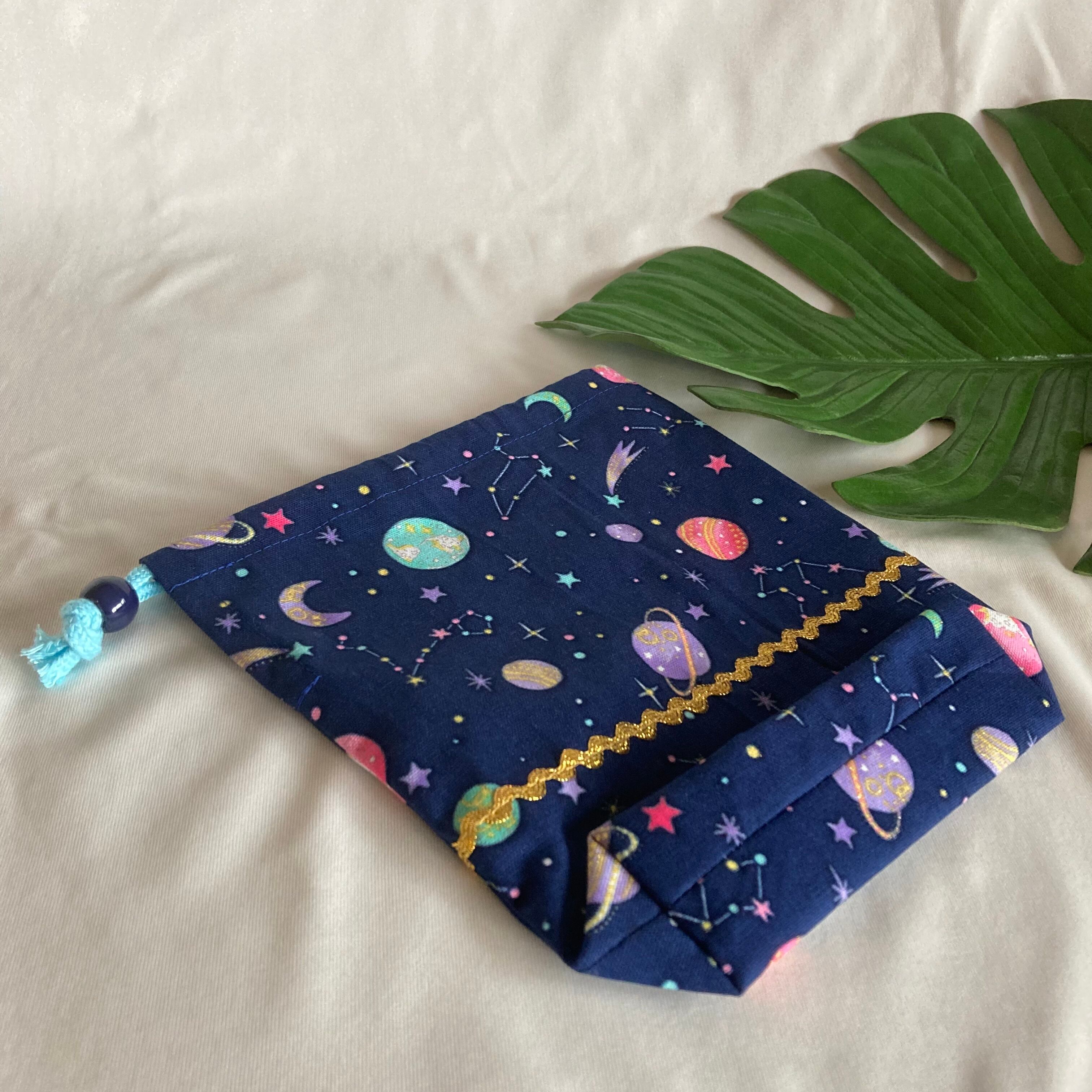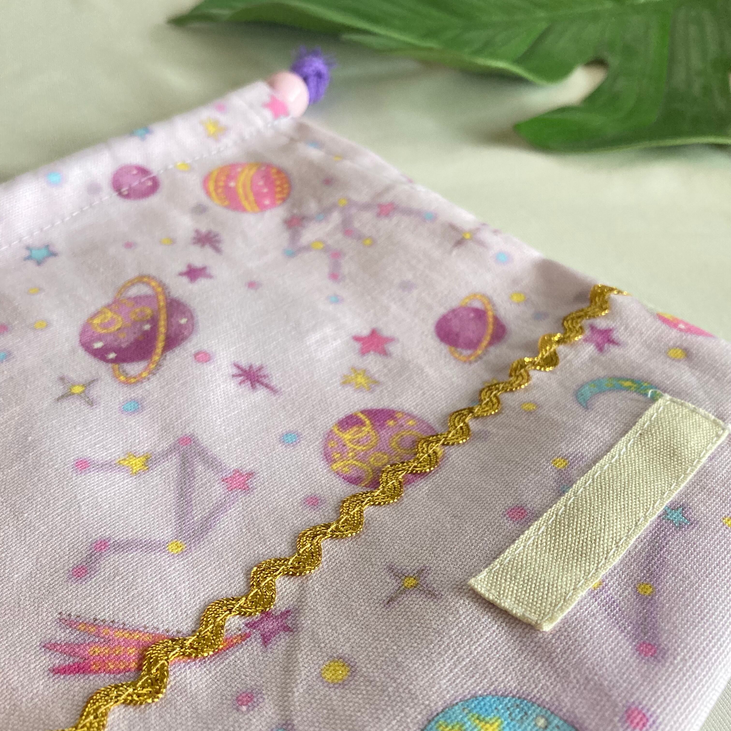 【オーダーOK】入園入学給食袋コップ入れ巾着★33きらきらラメの宇宙惑星銀河くすみニュアンスパステル女の子リボンレース