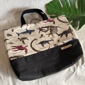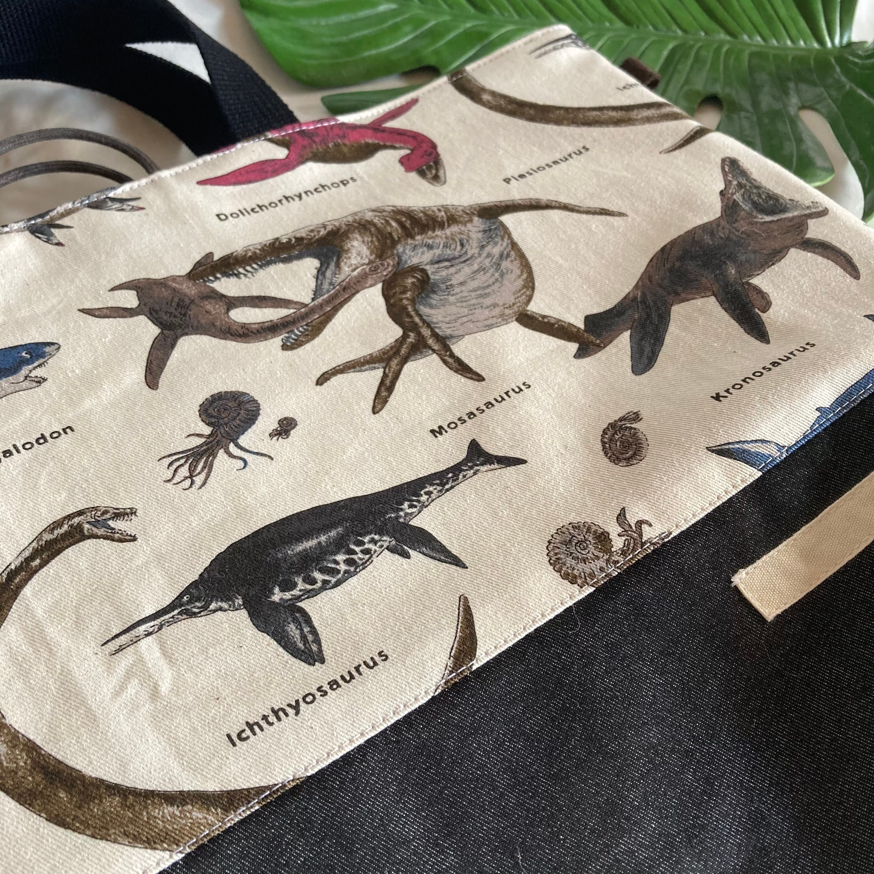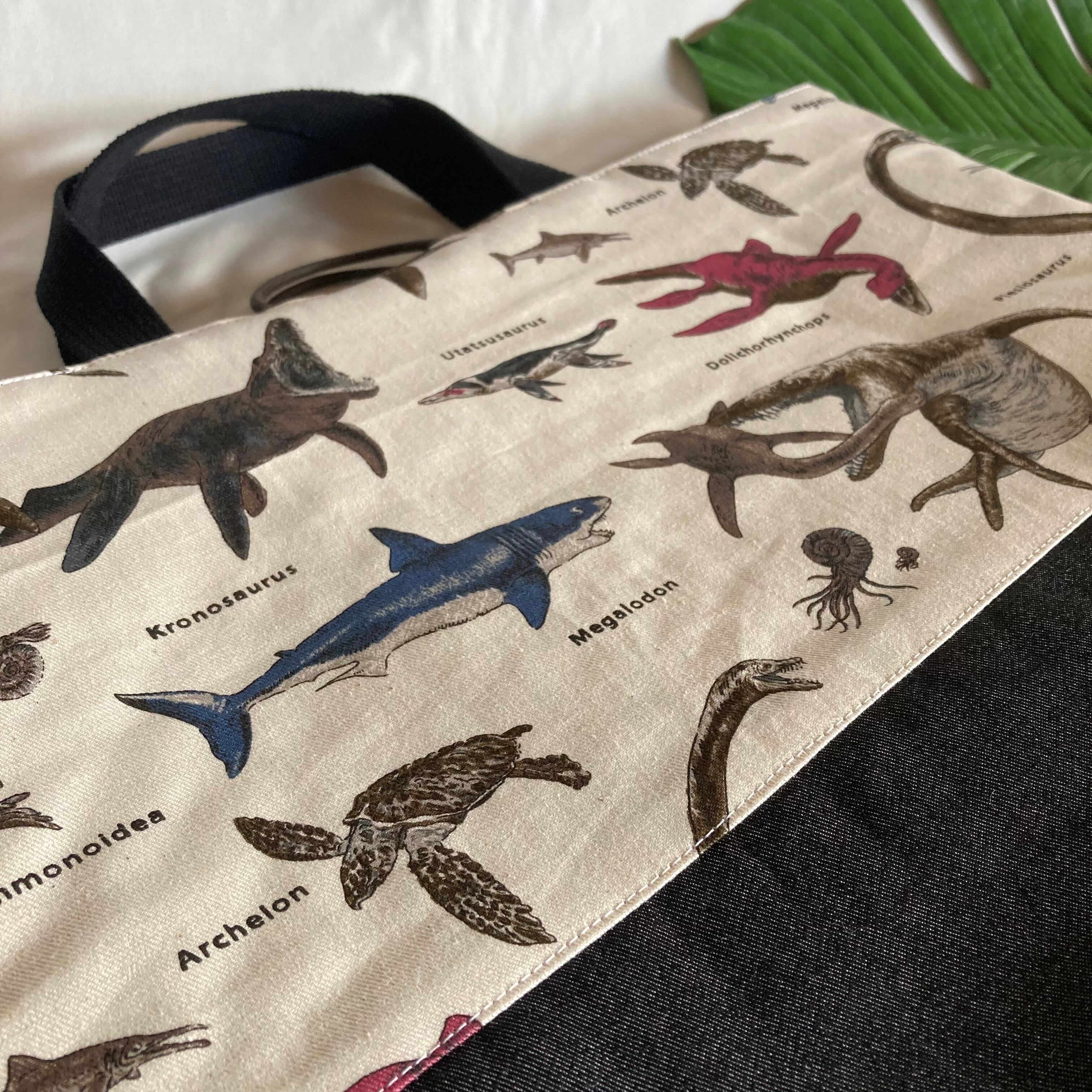 【オーダーOK】床につかない!入園入学レッスンバッグ手提げ絵本袋リバーシブル01海竜古代生物恐竜深海アーケロンモササウルスプレシオサウルスお名前スペース縫い付けマチ付きキルティングポケット