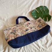 【サイズ】入り口ヨコ約56cm、タテ(マチ含まず)約24cm、底:ヨコ約47cm×マチ約8cm、持ち手2.5cm幅×長さ34cm