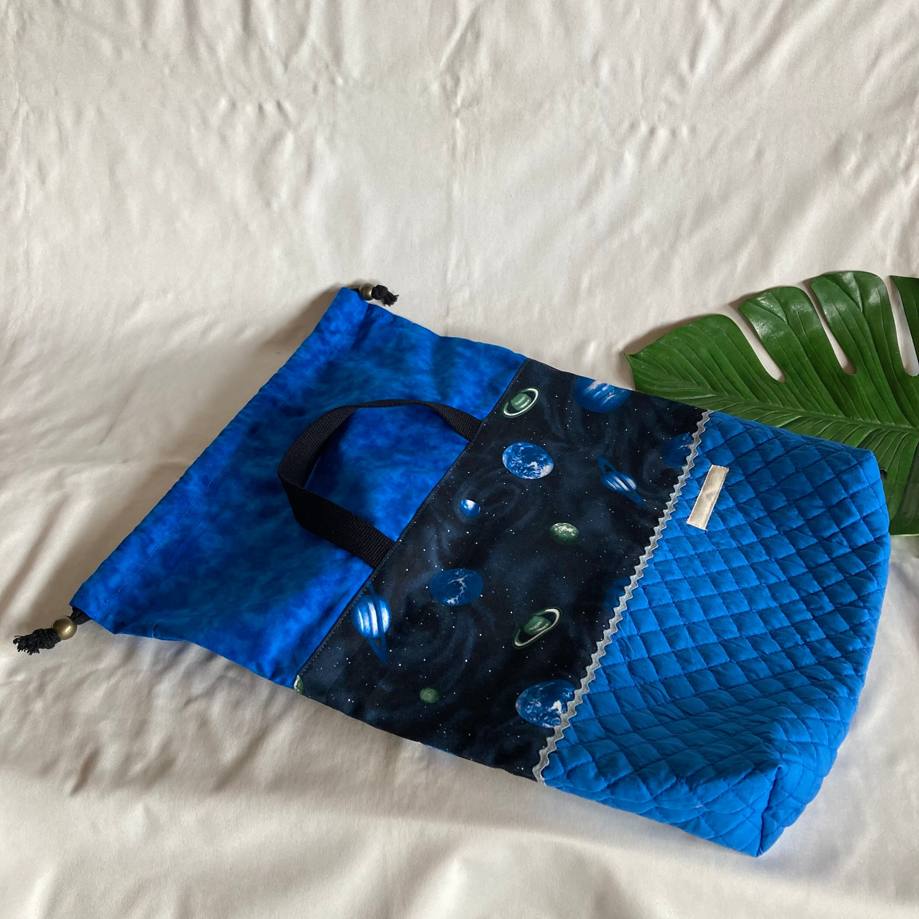 【オーダーOK】入園入学体操着お着替え袋内袋持ち手つき巾着★25神秘の宇宙銀河惑星縫い付けお名前小学校キルティングマチ