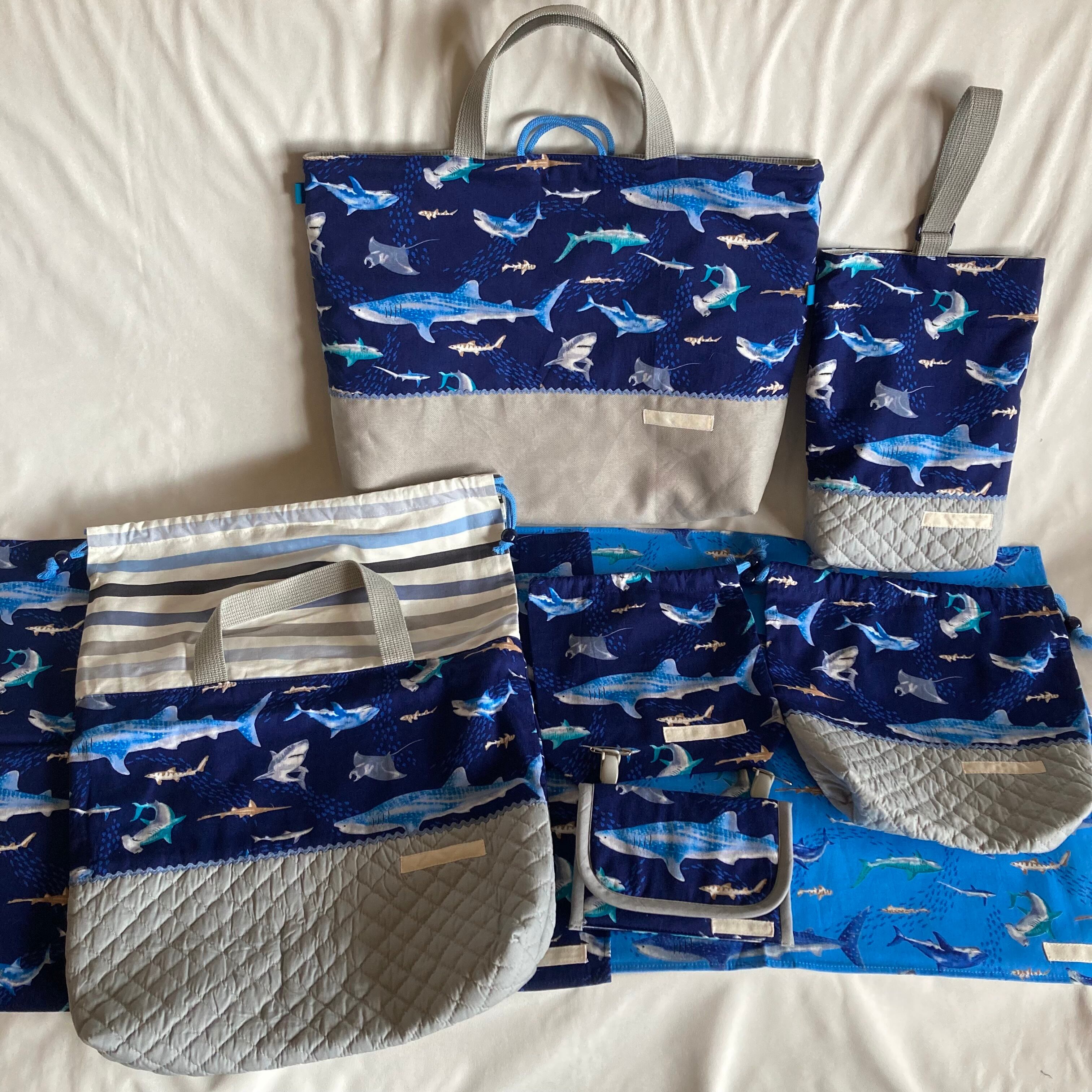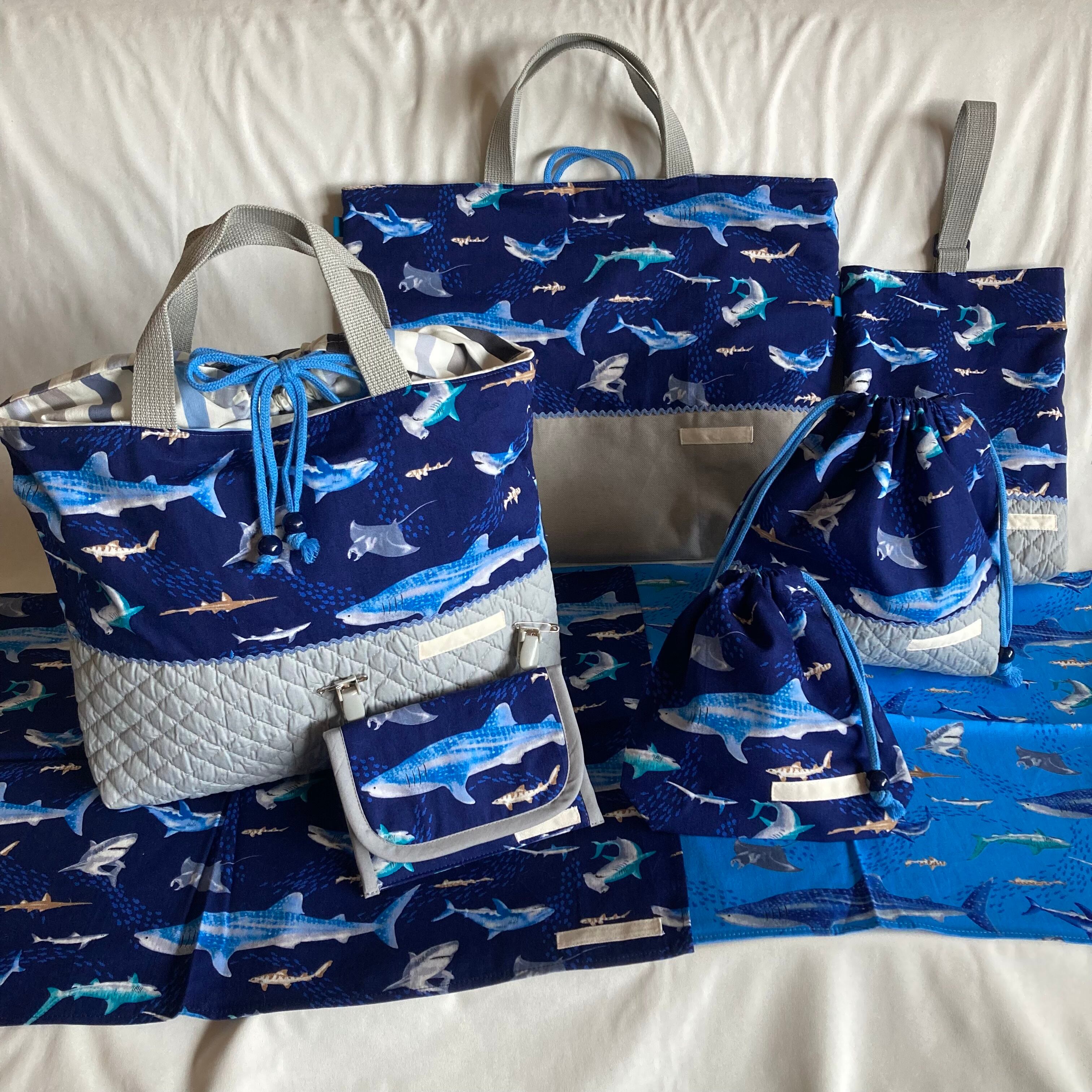 【オーダーOK】入園入学セット68さめサメ大集合Nシャチエイ★手提げ上履き給食お着替え巾着ランチョンマット移動ポケットナップサック海の生き物水族館小学校お名前スペース