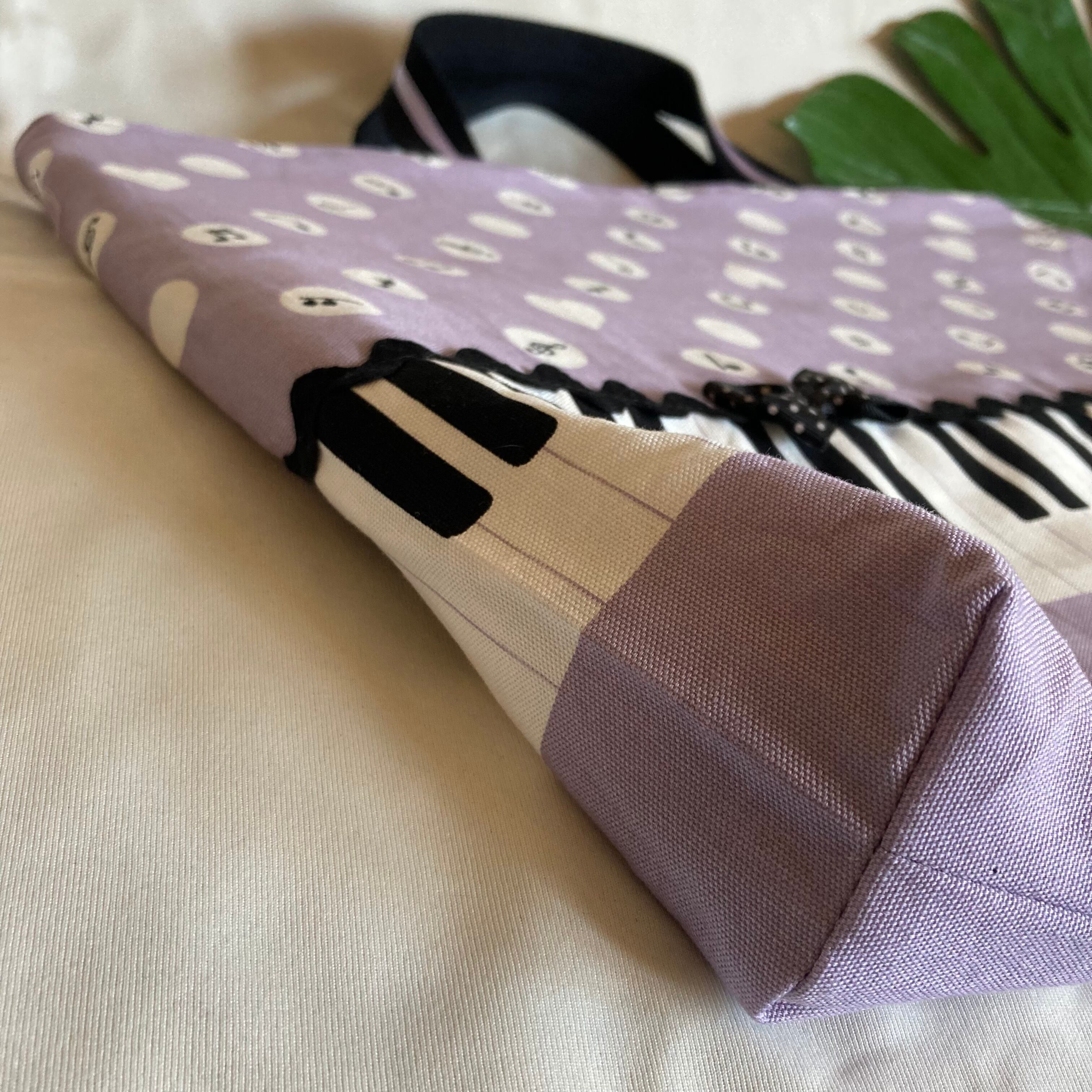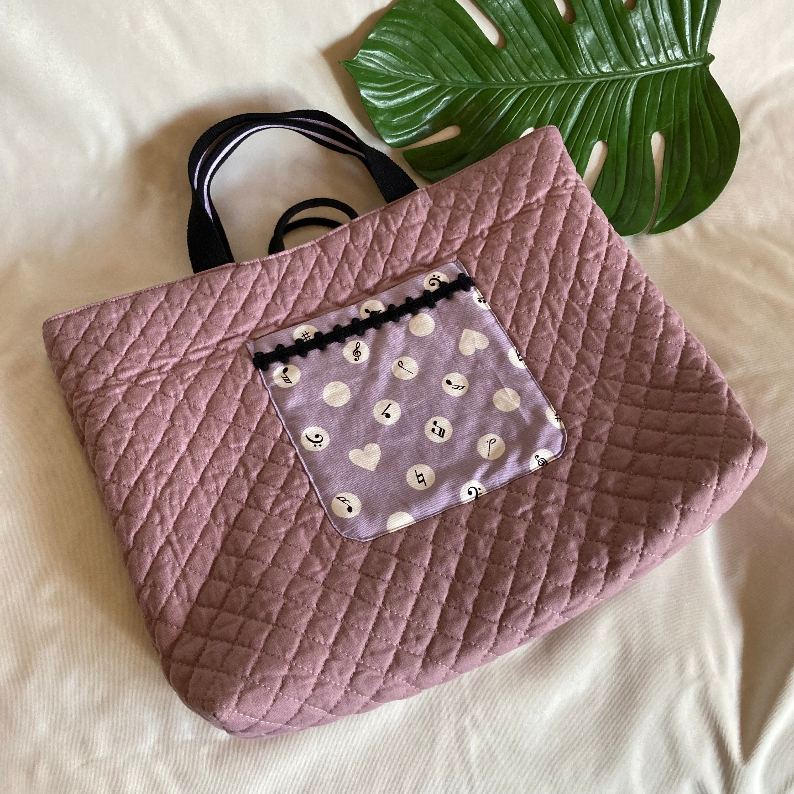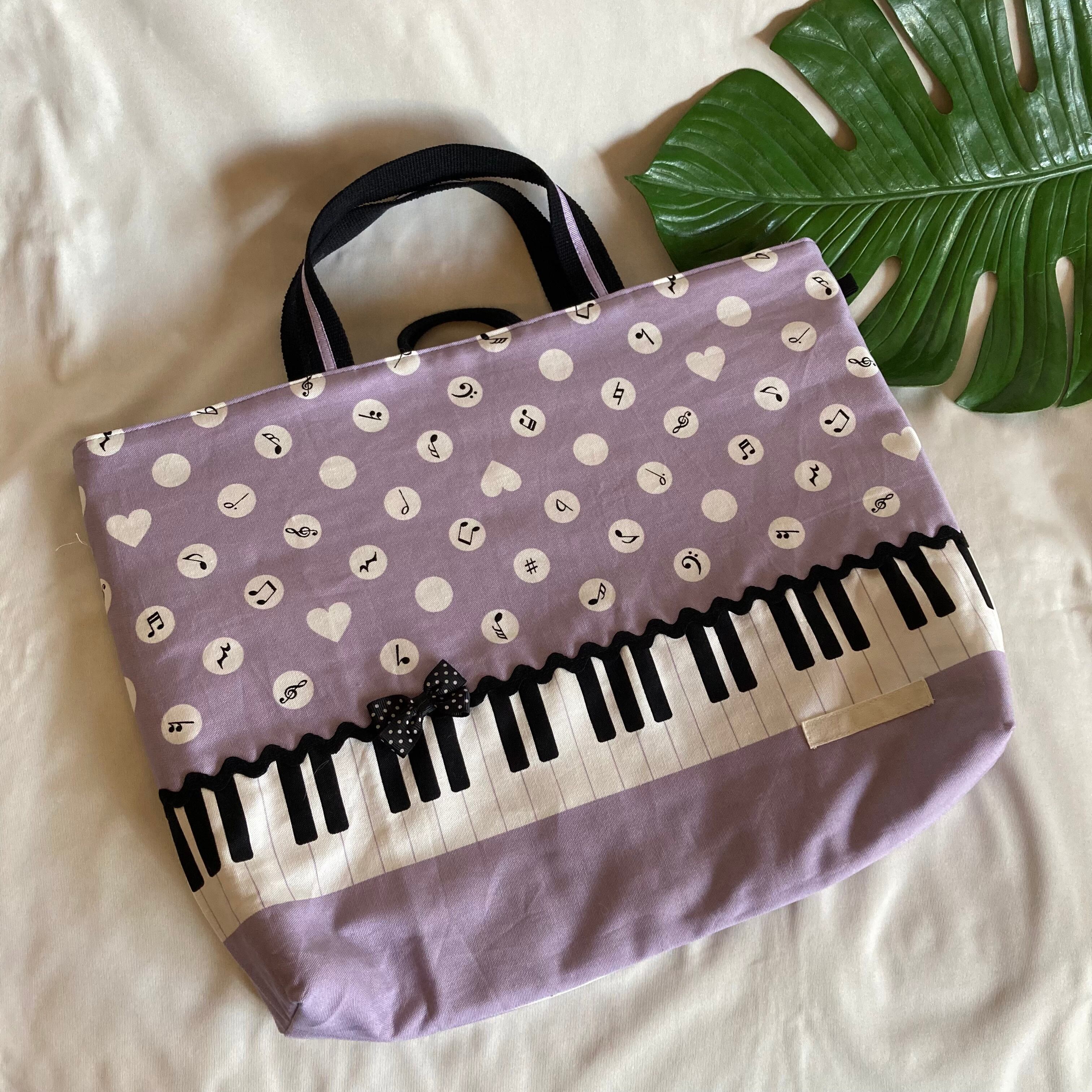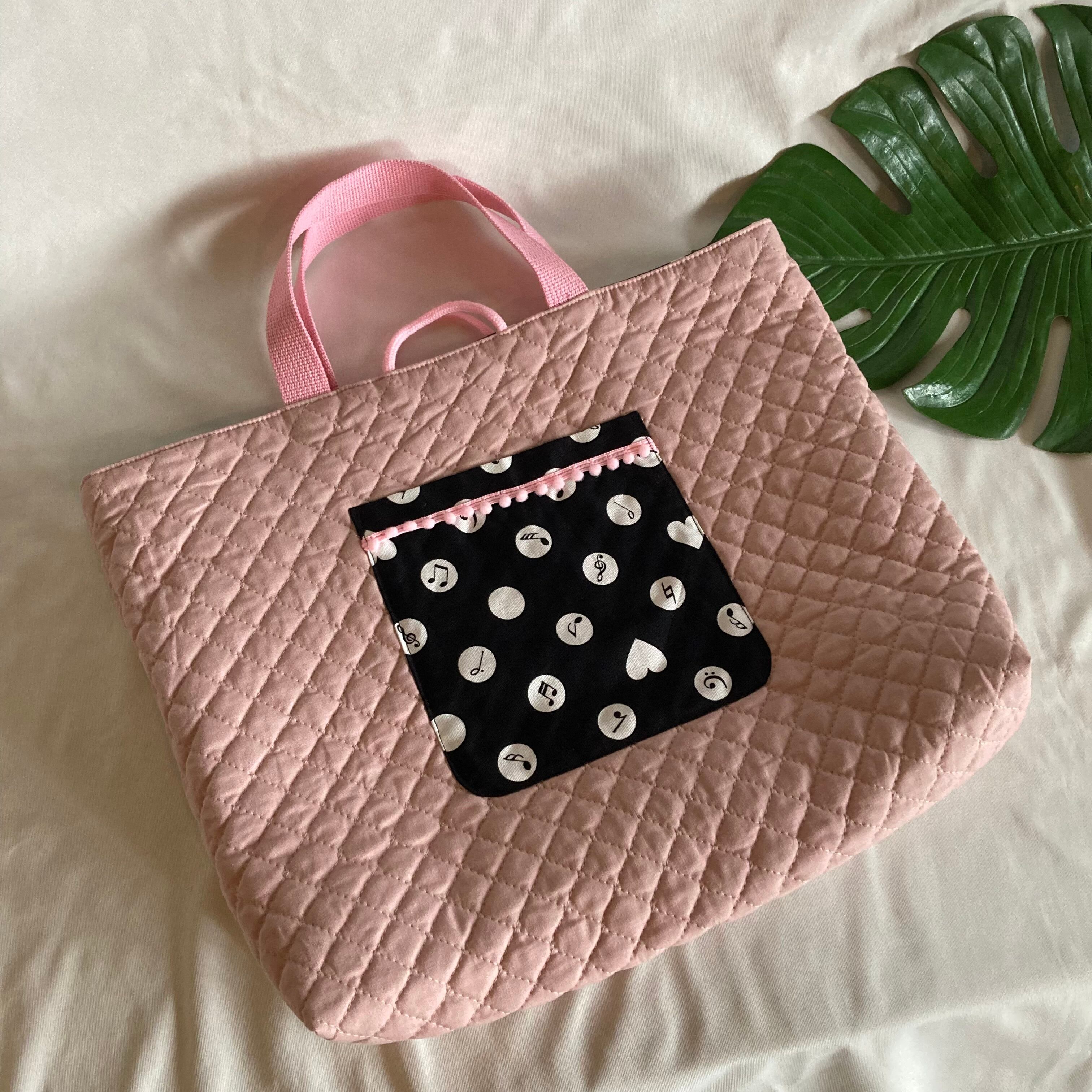 【床につかない!!】入園入学レッスンバッグ手提げ絵本袋リバーシブル★ピアノ鍵盤音楽楽器音符くすみピンク★縫い付けお名前キルティングマチポケットデニムくすみニュアンスパステル