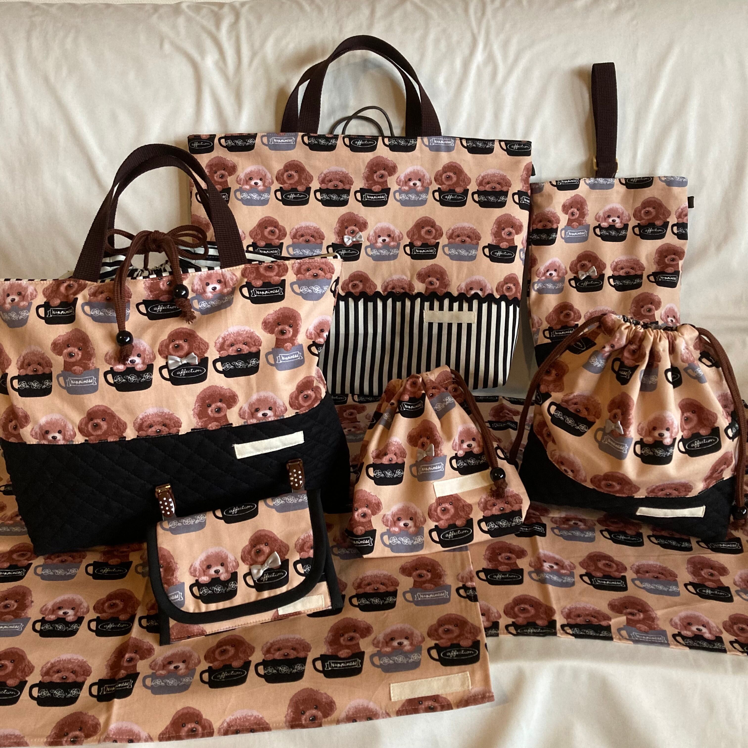 【オーダーOK】入園入学セット83ティーカッププードルトイプードル犬★手提げレッスンバッグ絵本袋シューズ体操着コップ上履き給食着替え巾着ランチョンマット移動ポケットくすみニュアンスパステル